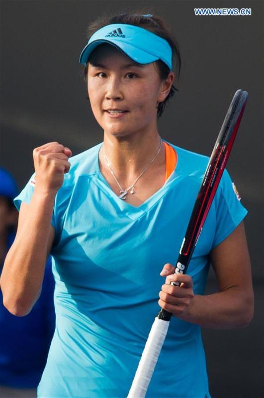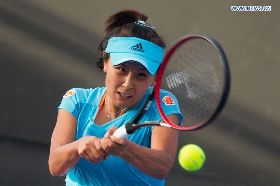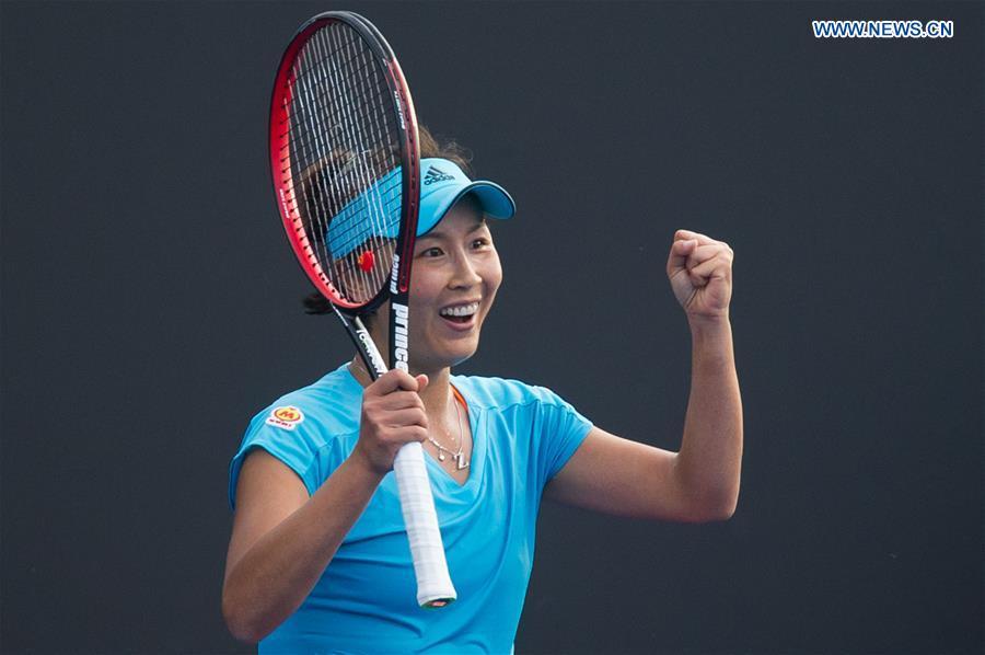 Peng Shuai of China hits the ball during the women's singles first-round match against Daria Kasatkina of Russia at the Australian Open Tennis Championships in Melbourne, Australia, Jan. 16, 2017. Peng won 2-0. (Xinhua/Bai Xue)