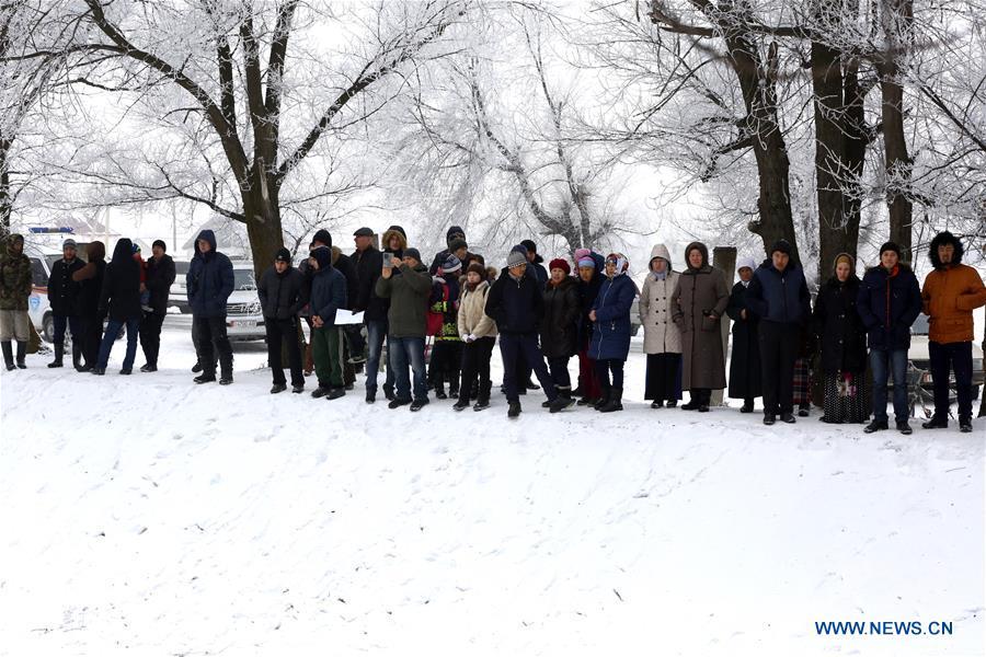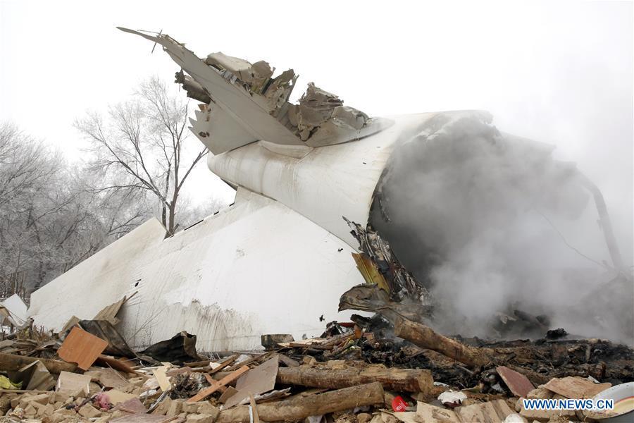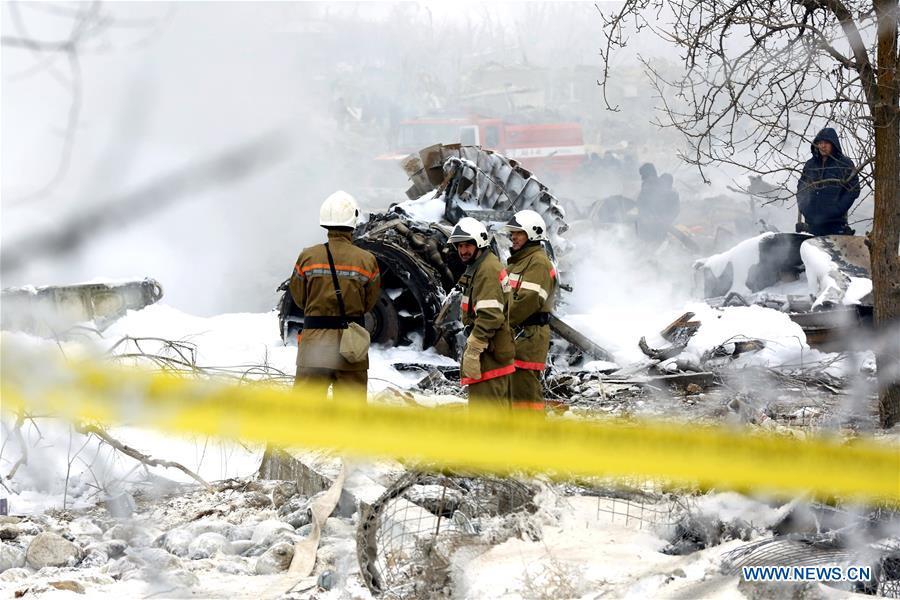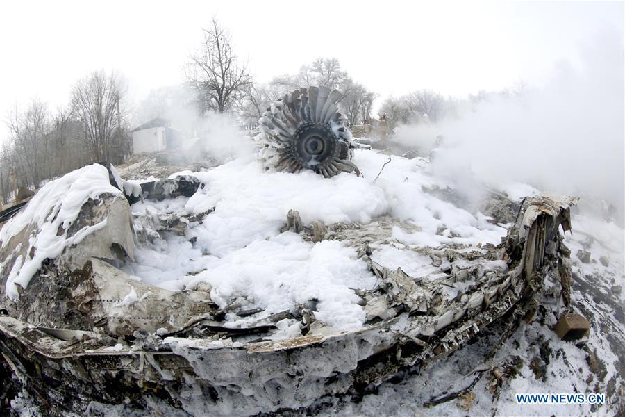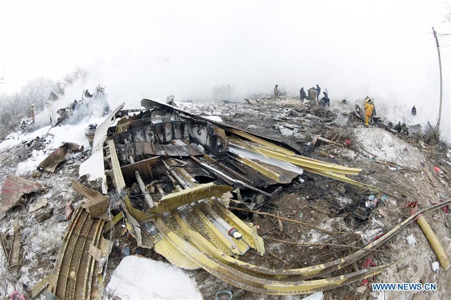 Firefighters work at the crash site of Turkish Airlines cargo plane near Bishkek's Manas international airport, in Kyrgyzstan, on Jan. 16, 2017. A Turkish Airlines cargo plane crashed near Manas international airport of Kyrgyzstan on Monday, killing at least 32 people, according to the country's Emergency Ministry. (Xinhua/Roman Gainanov)