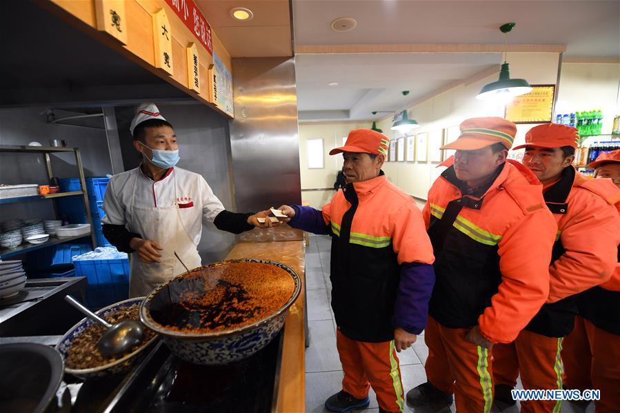 A sanitation worker eats free beef noodles at a beef noodle restaurant in Lanzhou, capital of northwest China's Gansu Province, Jan. 17, 2017. Lanzhou has launched a funding plan to provide more than 9,000 sanitation workers in its five districts and three counties with free beef noodles as their breakfast. A total of 242 beef noodle restaurants have participated in the campaign by Jan. 16. (Xinhua/Fan Peishen)