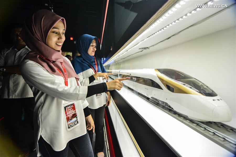 A model of China's bullet train is on display at an exhibition on high speed rail in Kuala Lumpur, Malaysia, Jan. 16, 2017. A Chinese consortium led by China Railway Corporation (CRC), which has announced its intention to build the upcoming Kuala Lumpur-Singapore High Speed Rail (HSR), started its bidding efforts by holding an experience exhibition on Monday in Kuala Lumpur. (Xinhua/Chong Voon Chung)
