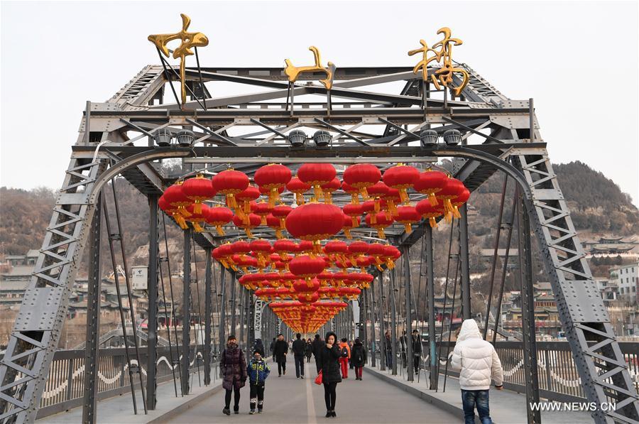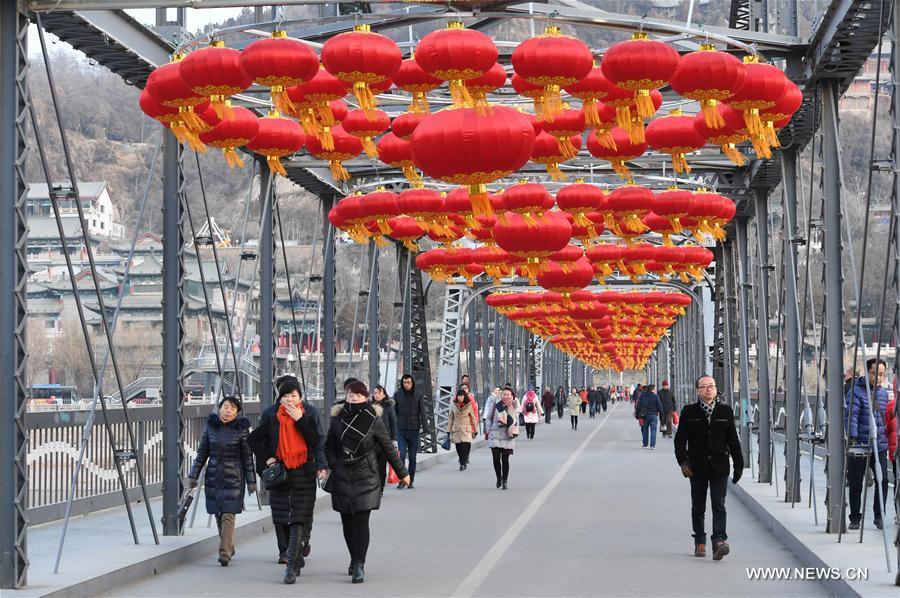 People walk under red lanterns on the Zhongshan Bridge across the Yellow River in Lanzhou, capital of northwest China's Gansu Province, Jan. 17, 2017. More than 1,000 lanterns have been put up on the Zhongshan Bridge to greet the Spring Festival, or the Chinese traditional lunar New Year, which falls on Jan. 28 this year. (Xinhua/Fan Peishen)