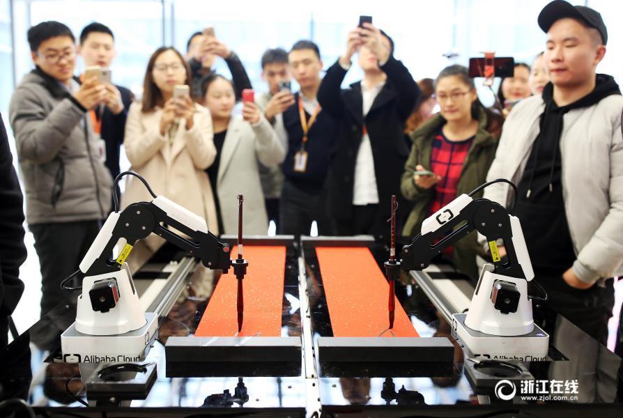 AliCloud artificial intelligence ET, shows of its calligraphy skills by writing Spring Festival couplets for Alibaba employees in Alibaba Xixi park in Hangzhou, east China's Zhejiang province on Monday. Employees were invited to "wake up" ET, talk to it, and then get tailored Spring Festival couplets written using its face recognition and voice analysis functions. (Photo/zjol.com.cn)