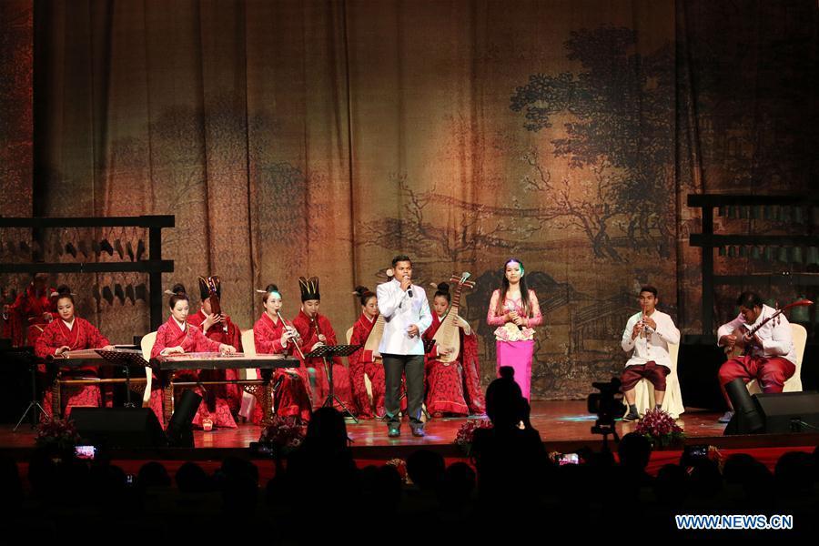 Chinese artists perform "Dancing on Seven Trays" at a Spring Festival concert in Phnom Penh, Cambodia, Jan. 17, 2017. Artists from the Huaxia Ancient Music Orchestra of China's Henan Museum performed traditional dances and music here Tuesday night to celebrate upcoming Chinese New Year, or Spring Festival. (Xinhua/Sovannara)