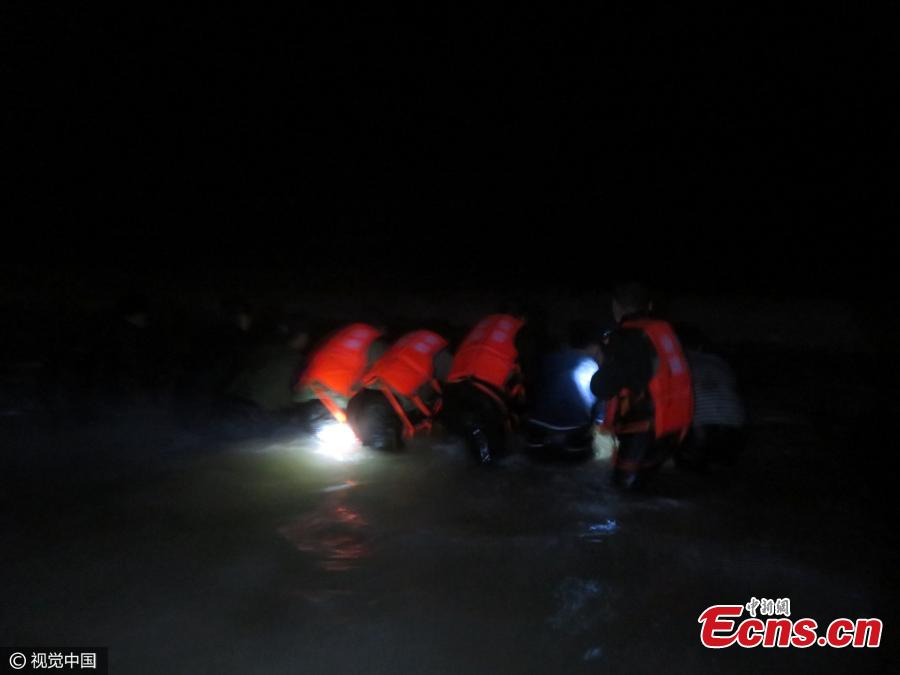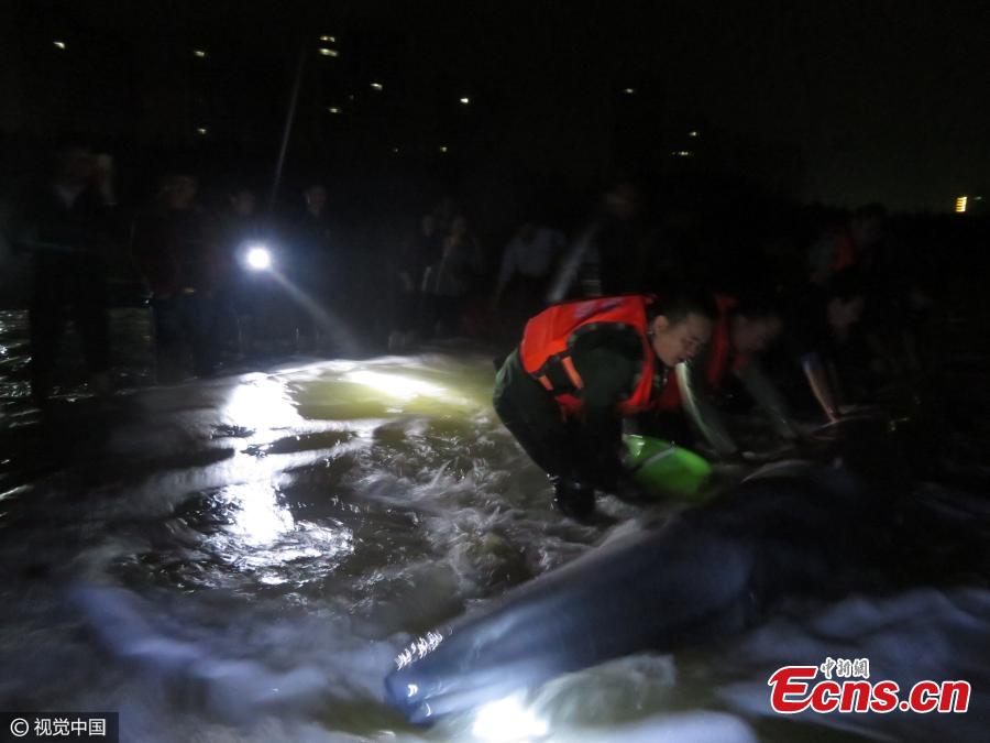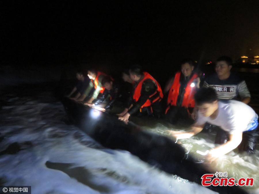 A fin whale is assisted to swim back to sea after becoming stranded on a beach in Shenzhen, South China’s Guangdong Province, Jan. 17, 2017. The 1.5-ton fin whale was about five meters long. It took armed police and local residents more than an hour to help it return the whale, which was thought to have become lost as a result of strong, cold winds. (Photo/CFP)