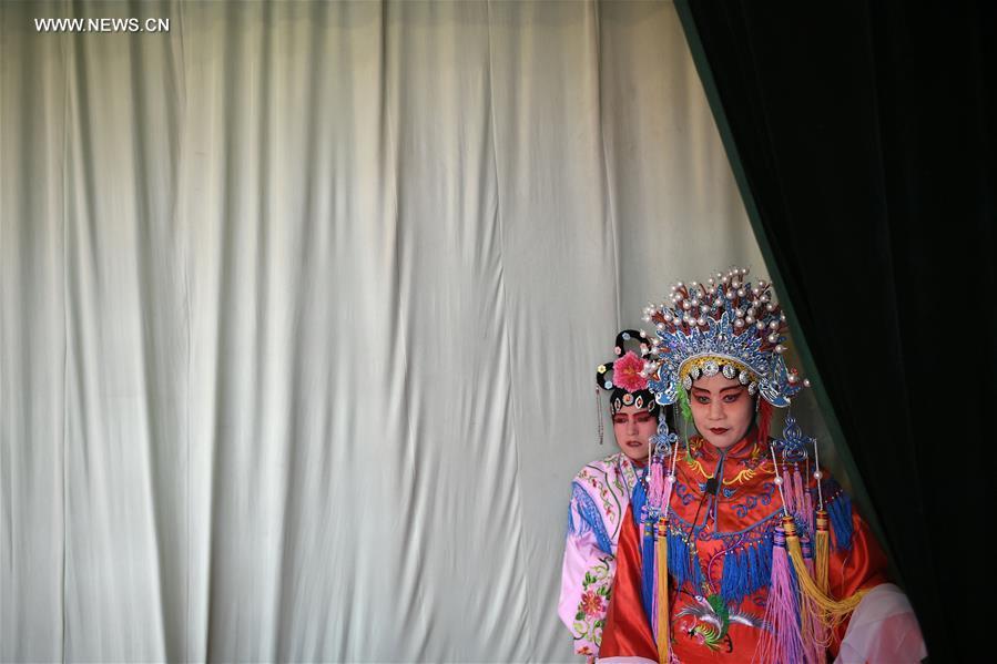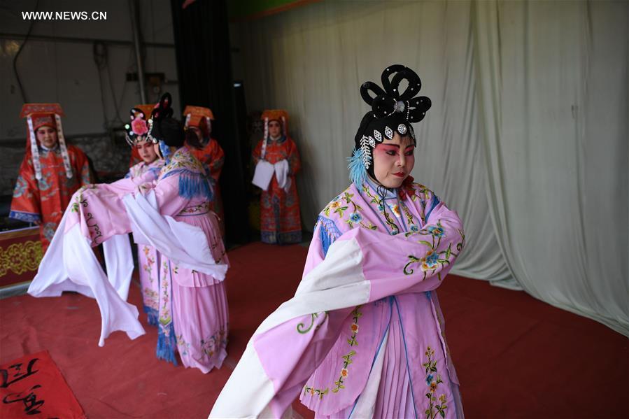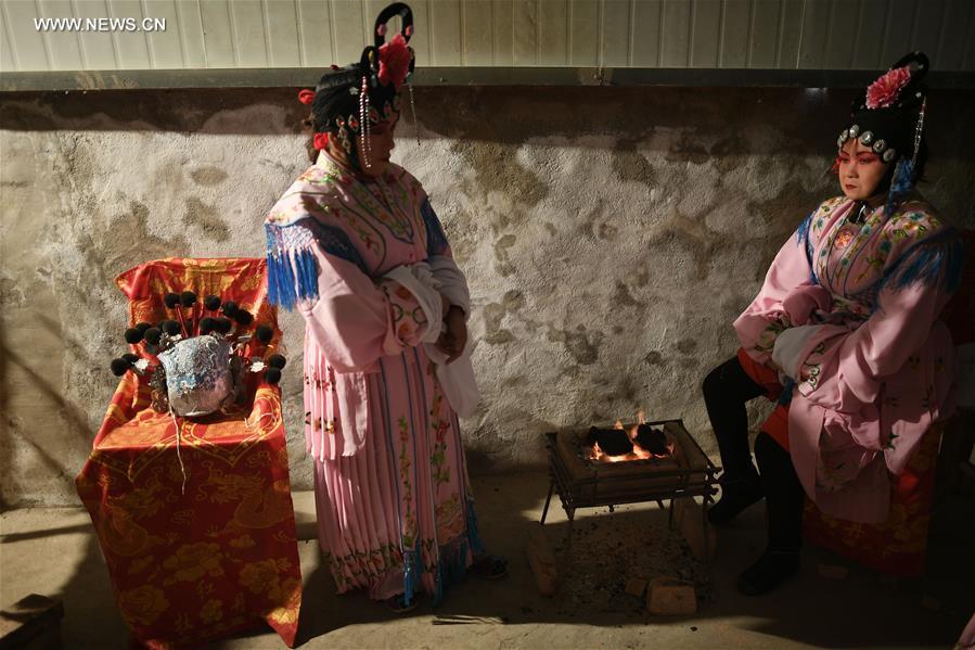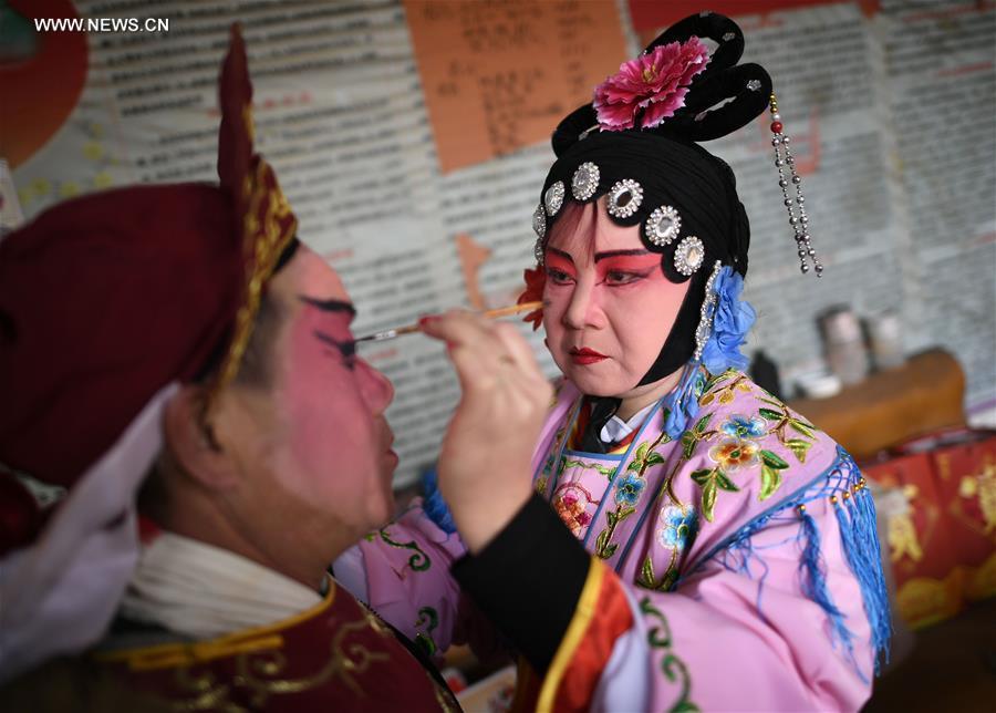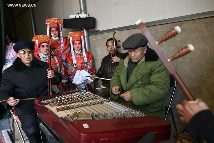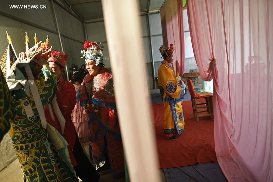 Members of a Shaanxi Opera team prepare before performing for spectators in Xinxing Village of Longde County, northwest China's Ningxia Hui Autonomous Region, Jan. 18, 2017. The Shaanxi Opera team, which consists of more than 30 amateurs who are farmers and non-professional opera performers, carried out tour performances for residents in towns and villages in rural areas during the Spring Festival holidays. Shaanxi Opera, commonly known as Qinqiang, is the oldest of all the Chinese operas that are still in existence today. (Xinhua/Wang Peng)