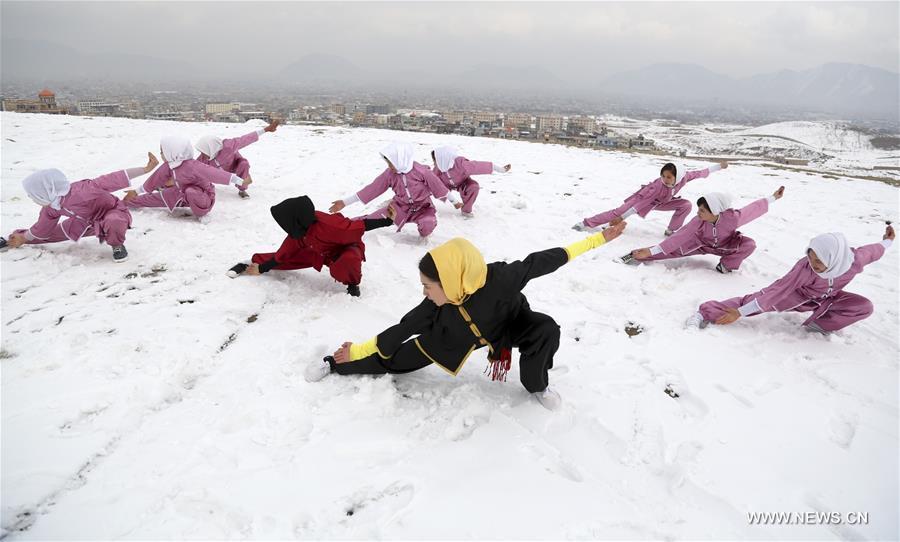 Seema Azimi (Front) teaches Afghan girls Wushu on the top of a hill in Kabul, capital of Afghanistan, Jan. 18, 2017. There are 20 Afghan girls learn Wushu in the Shaolin Wushu club in Kabul. Most of them are students. The eldest girl among them is 20 years old, and the youngest one is only 13 years old. They have been practicing this martial sport for almost two years. (Xinhua/Rahmat Alizadah)