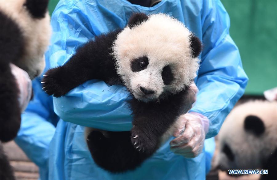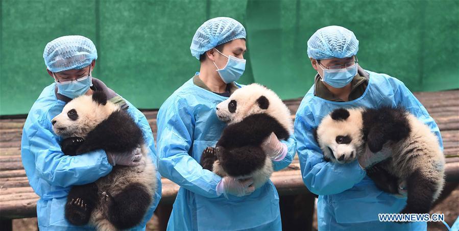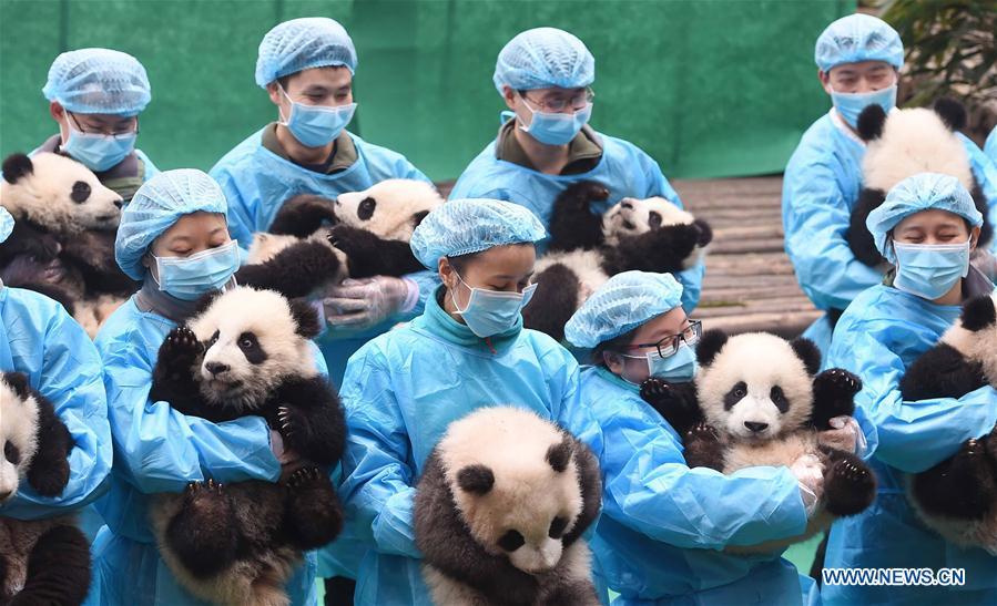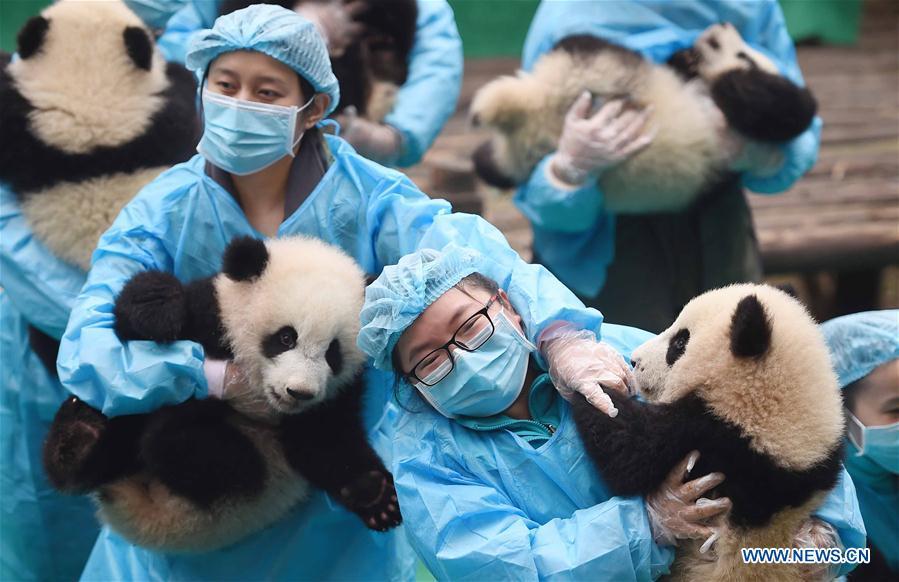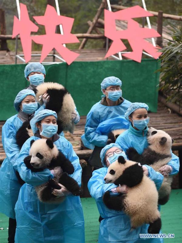 Giant panda cubs and their keepers attend an event to celebrate upcoming Chinese New Year in Chengdu Research Base of Giant Panda Breeding in Chengdu, capital city of southwest China's Sichuan Province, Jan. 20, 2017. A total of 23 cubs born in the base in 2016 were seen on Friday's event. (Xinhua/Xue Yubin)