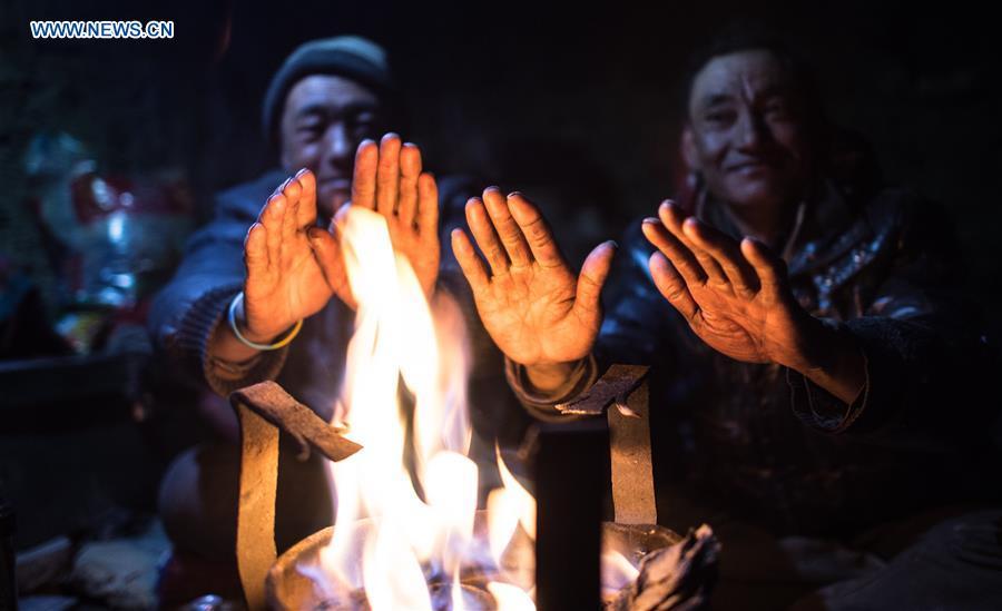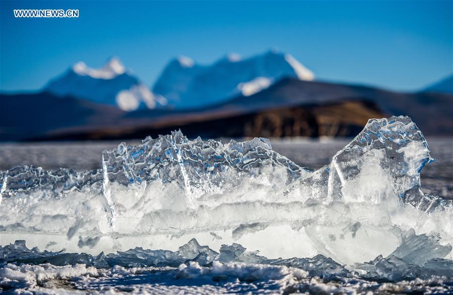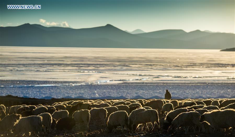 Photo taken on Jan. 19, 2017 shows the sheep flock by the plateau lake Puma Yumco in Nagarze County, southwest China's Tibet Autonomous Region. (Xinhua/Purbu Zhaxi)