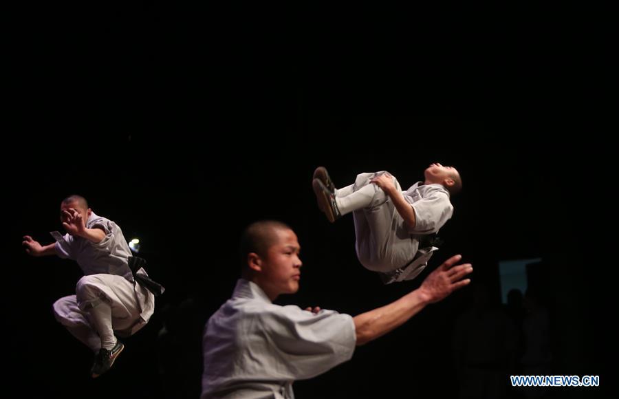 Monks from China's Shaolin Temple perform Kungfu on the occasion of celebrating Chinese New Year with Palestinians in West Bank city of Ramallah, on Jan. 22, 2017. (Xinhua/Fadi Arouri)