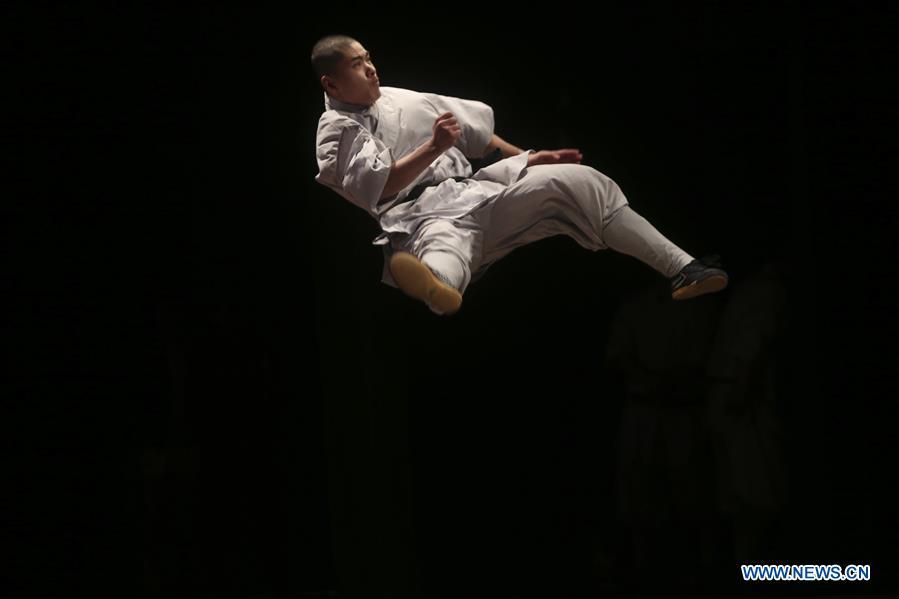 A monk from China's Shaolin Temple performs Kungfu on the occasion of celebrating Chinese New Year with Palestinians in West Bank city of Ramallah, on Jan. 22, 2017. (Xinhua/Fadi Arouri)