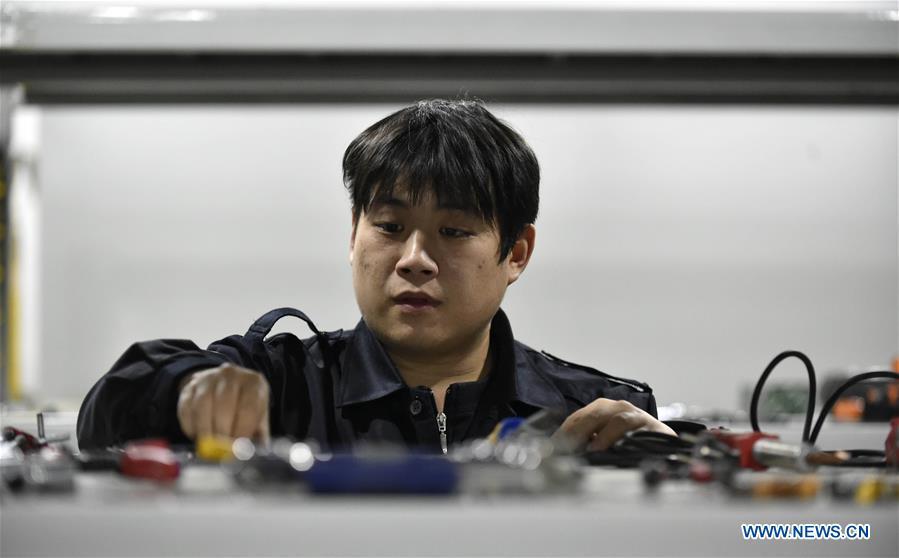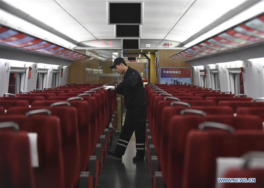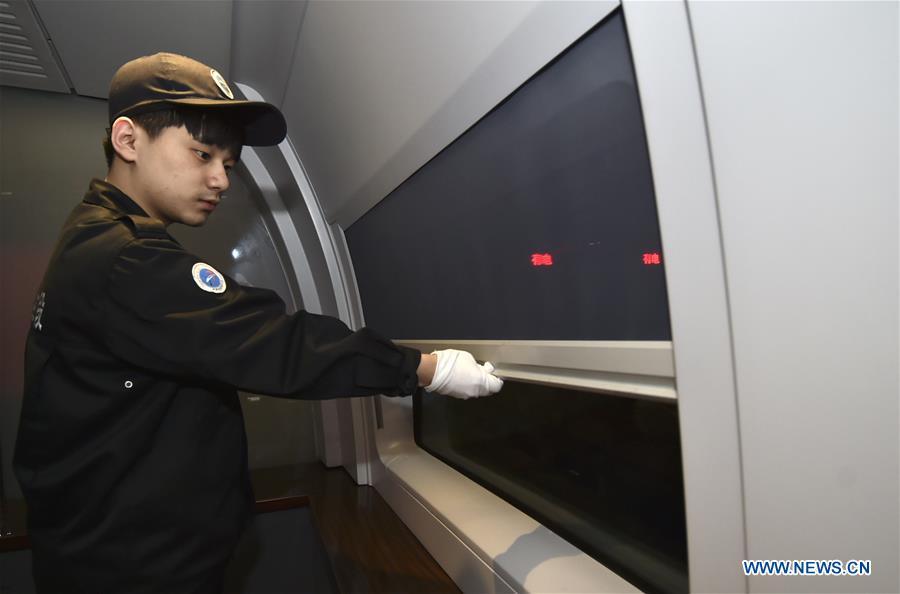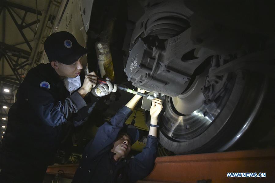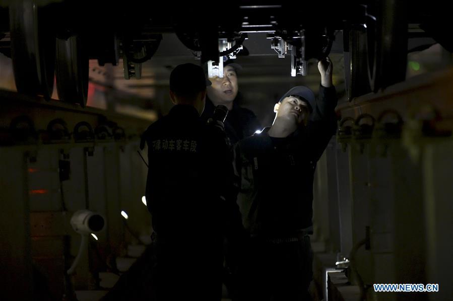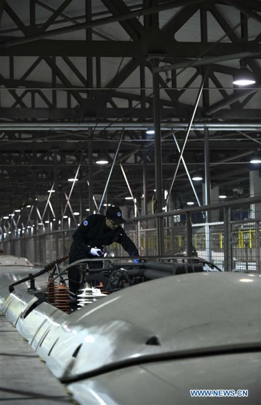 Mechanics maintain a bullet train which is used for Spring Festival travel rush at a maintenance center in Tianjin, north China, Jan. 25, 2017. (Xinhua/Lian Yi)