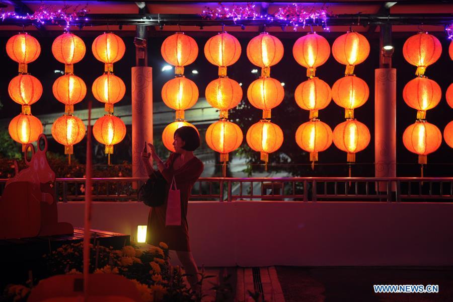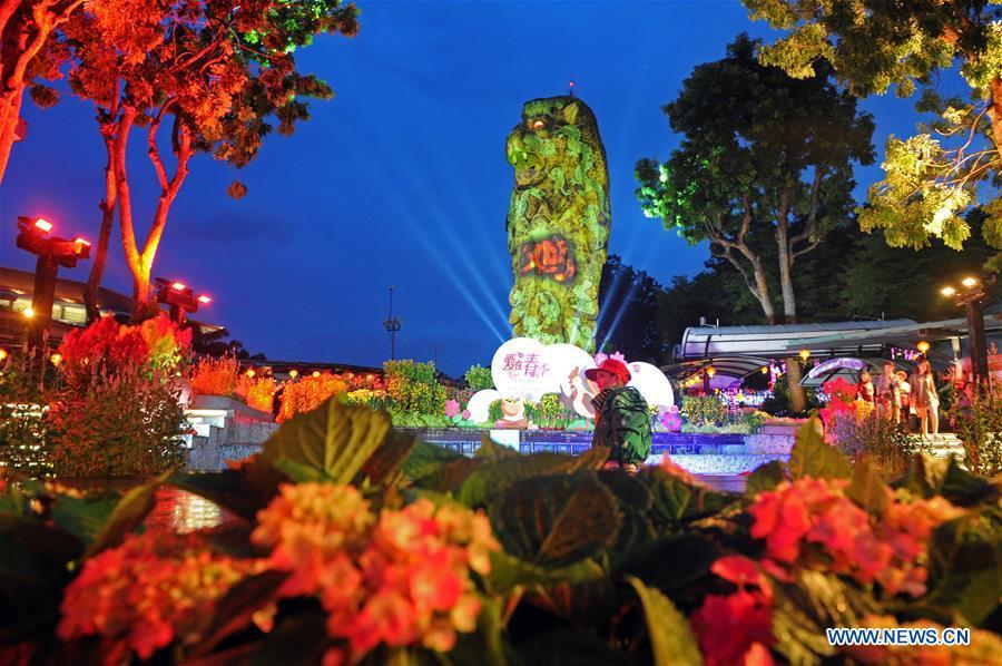 Visitors view light installations at "Love in Springtime" light exhibition in Singapore's Sentosa island, Jan. 25, 2017. The "Love in Springtime" exhibition is held from Jan. 21 to Feb. 26 to celebrate Chinese Lunar New Year. (Xinhua/Then Chih Wey)