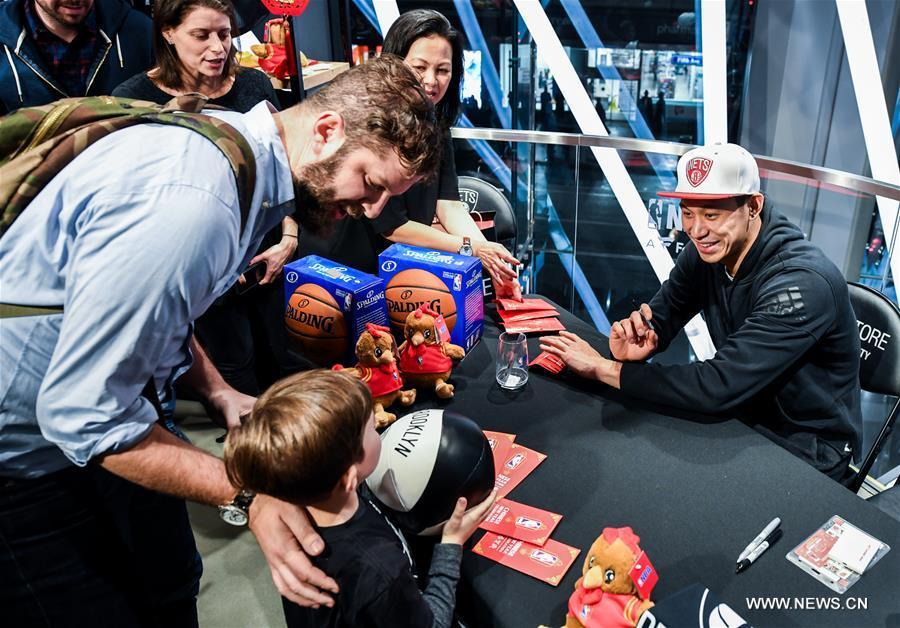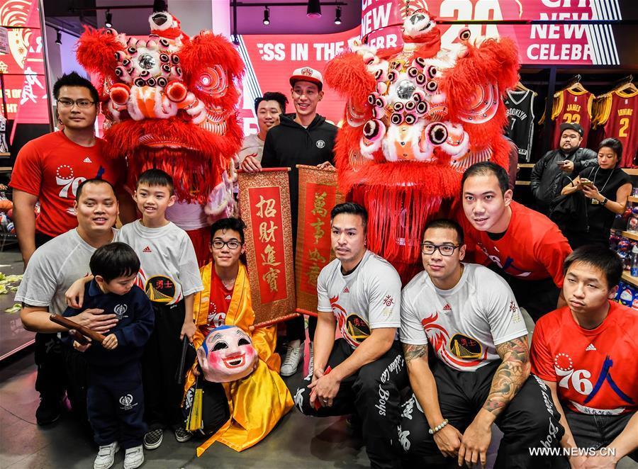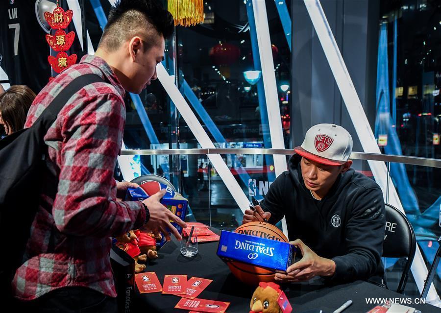 Brooklyn Nets guard Jeremy Lin (C, back) poses for a photo with lion dance performers at a Chinese New Year celebration at the NBA store on Manhattan 5th Avenue, New York City, the United States, on Jan. 24, 2017. Brooklyn Nets guard Jeremy Lin said on Monday he expected to be back to action in 3-5 weeks from his left hamstring injury. (Xinhua/Li Rui)