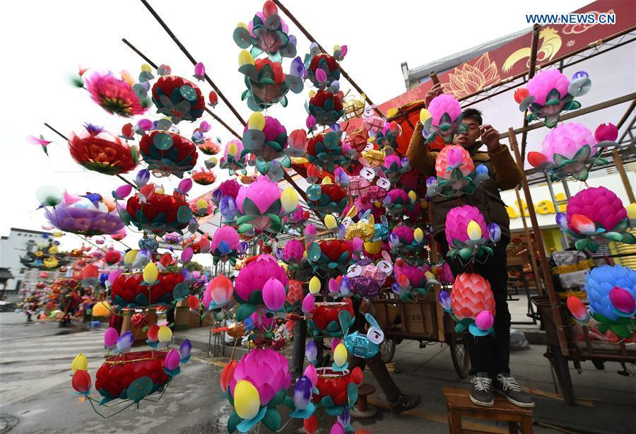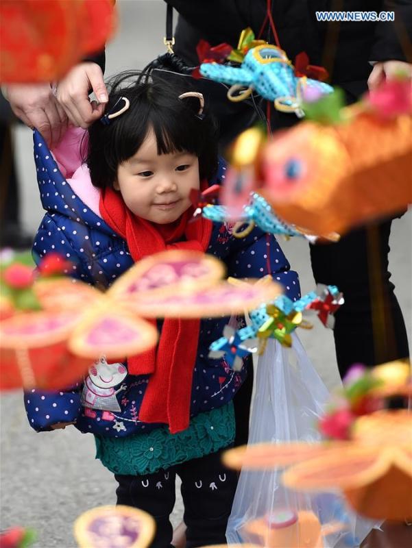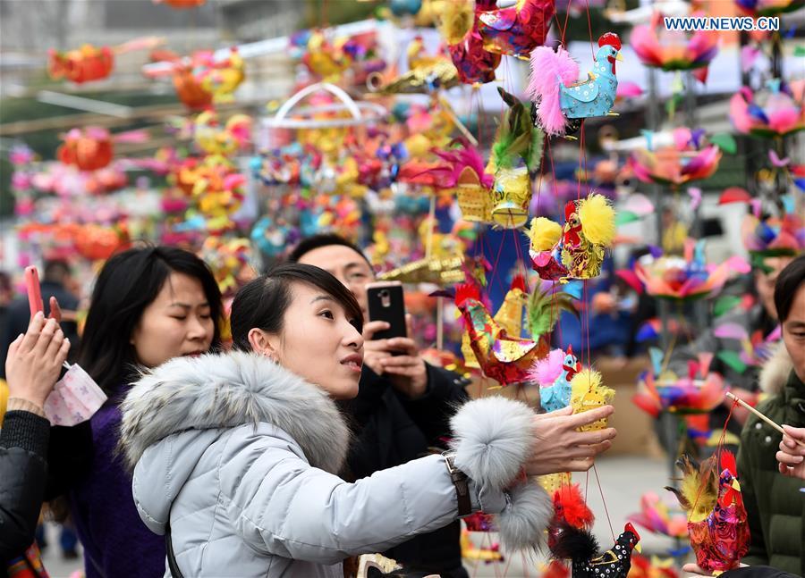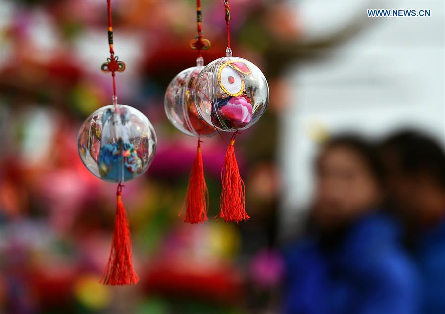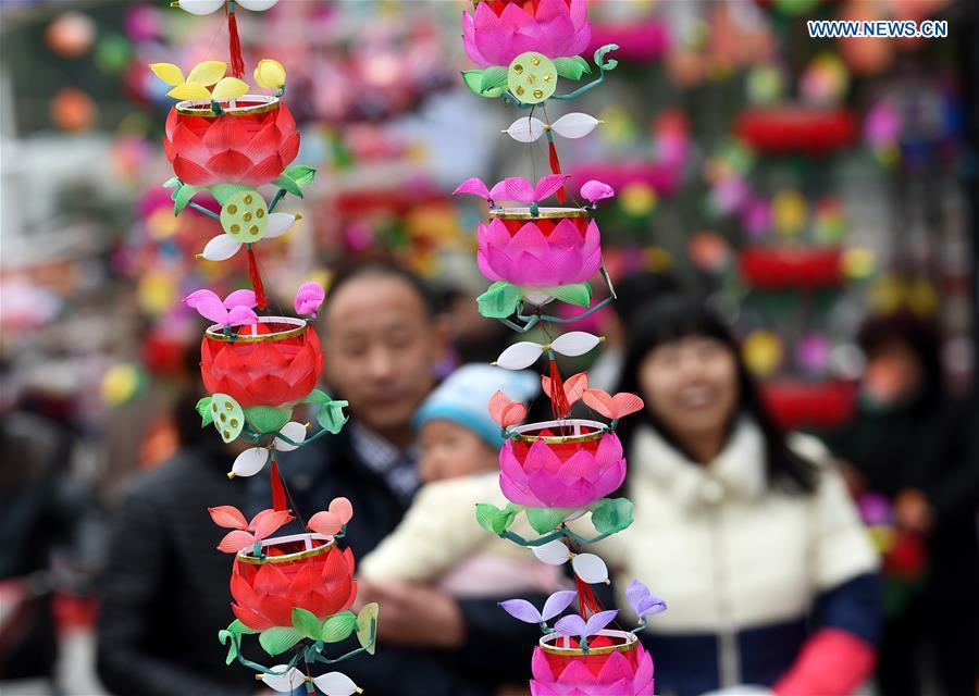 People shop at the lantern market during the 31st Qinhuai Lantern Fair in Nanjing, capital of east China's Jiangsu Province, Jan. 27, 2017. The lantern market opened to the public on the eve of the Spring Festival. (Xinhua/Sun Can)