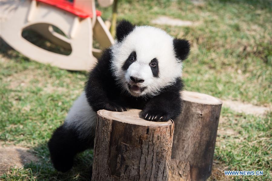 Panda cub "Jianjian" plays at a zoo in Macao, south China, Jan. 27, 2017. Seven-month-old twin panda cubs "Jianjian" and "Kangkang" and their keepers met the media here, on the eve of the Spring Festival. (Xinhua/Cheong Kam Ka)