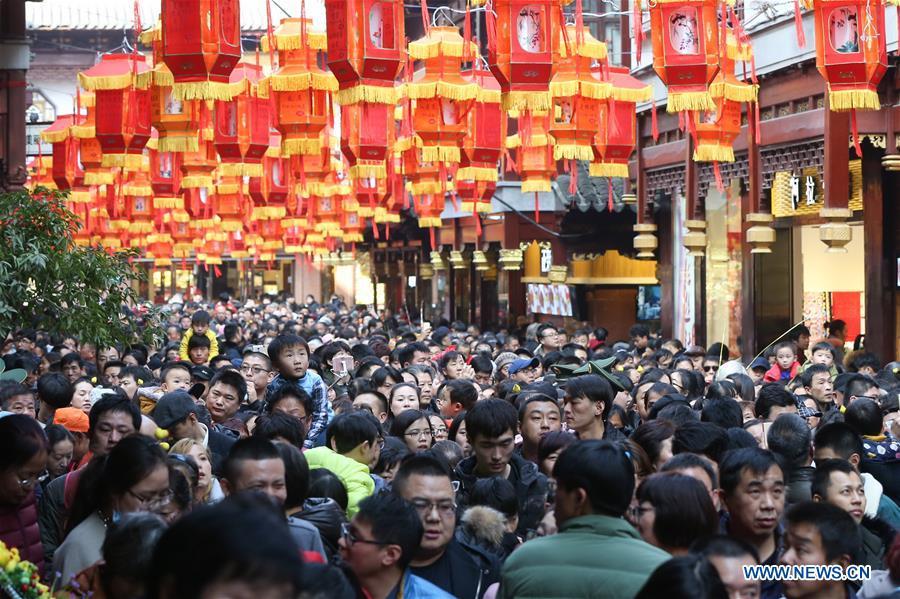 Tourists visit the Kuanzhai Lane Historic District in Chengdu, capital of southwest China's Sichuan Province, Jan. 28, 2017. According to data from the China National Tourism Administration, on Saturday, the number of tourists received in China reached 65.2 million, generating income totaled 76 billion yuan (around 11.1 billion U.S. dollars). (Xinhua/Xue Yubin)