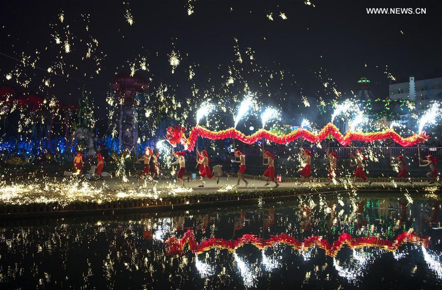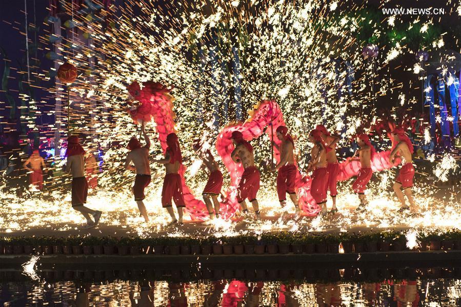 People perform a fire dragon dance in a shower of molten iron which sparks like fireworks in Wuhan, capital of central China's Hubei Province, Jan. 28, 2017. The performance was held to celebrate Chinese lunar new year. (Xinhua/Xiong Qi)