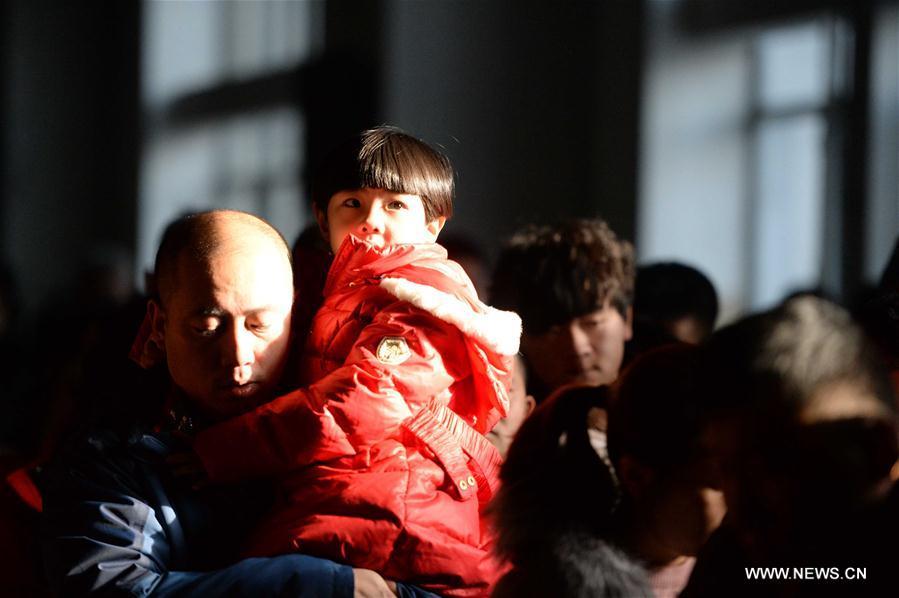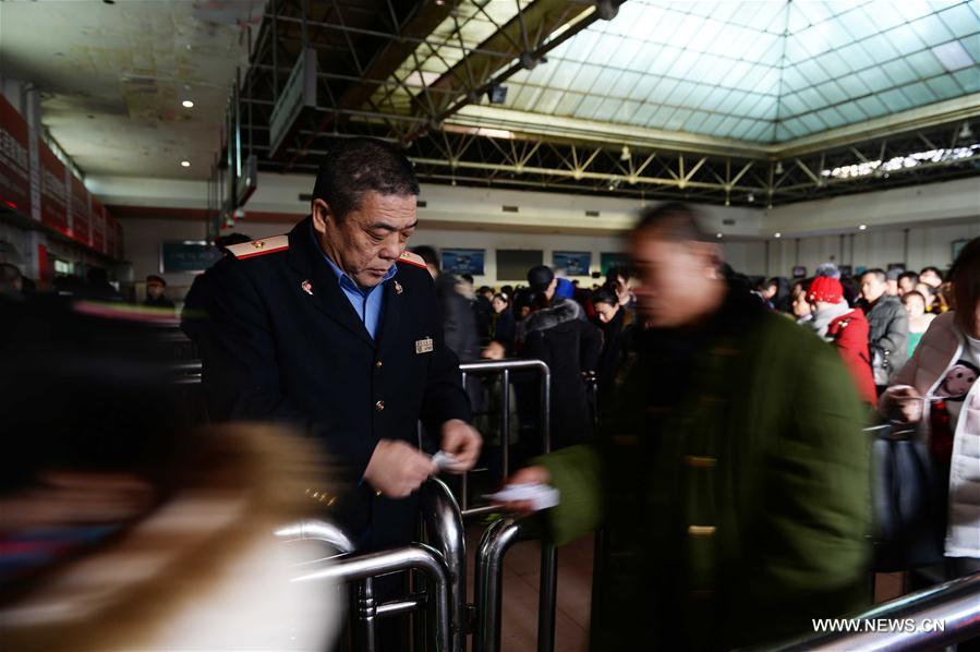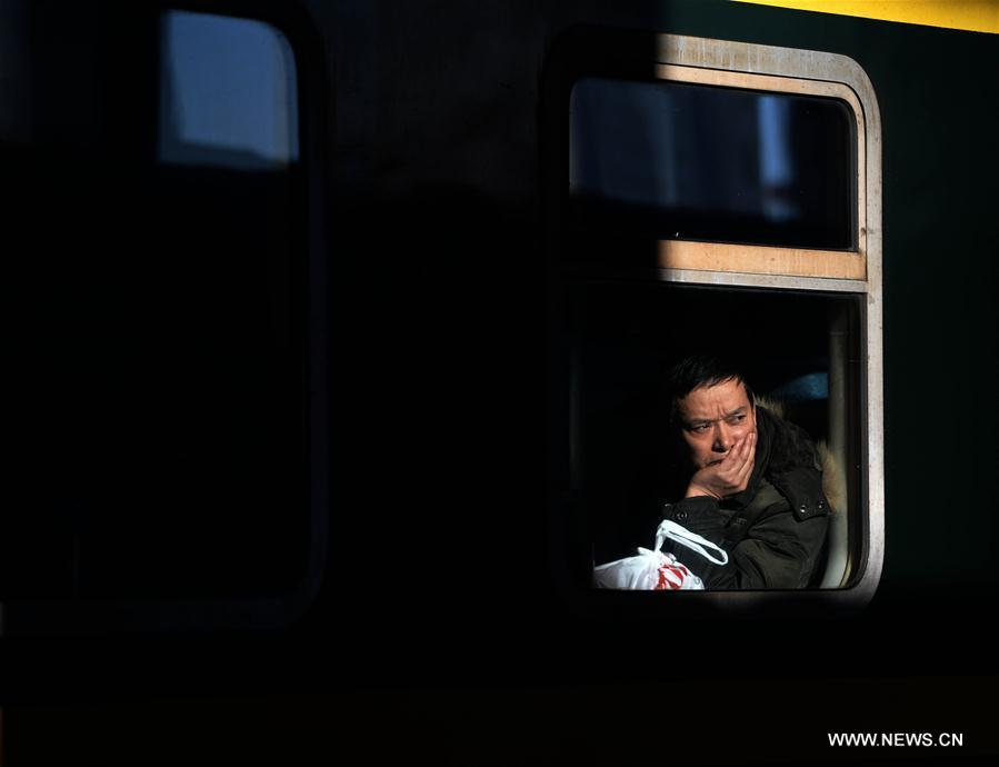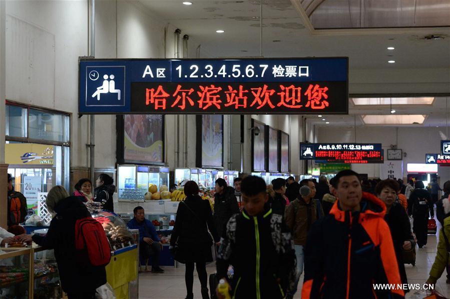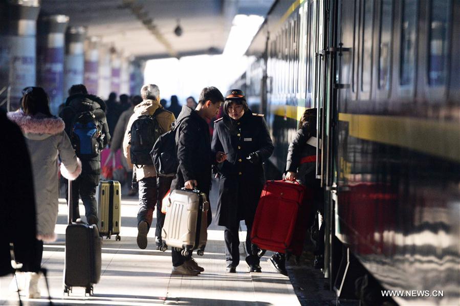 Passengers get on a train at the Harbin Railway Station in Harbin, capital of northeast China's Heilongjiang Province, Feb. 2, 2017. Travel peak appeared again as people return to work on the last day of week-long Lunar New Year Holiday. (Xinhua/Wang Kai)