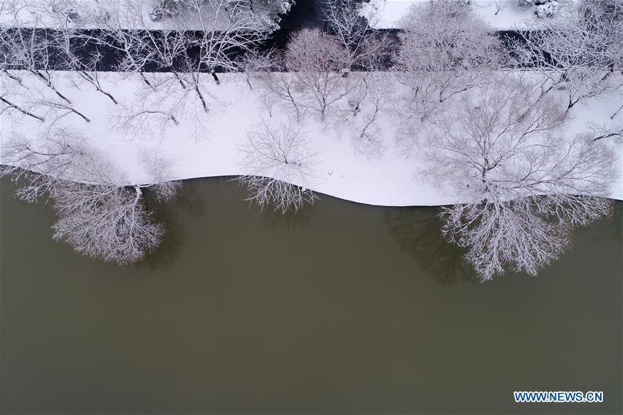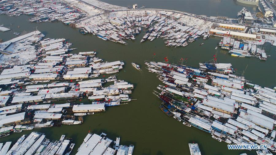 Aerial photo taken on Feb. 1, 2017 shows the snow scenery of Lianyungang, east China's Jiangsu Province. (Xinhua/Wang Jianmin)