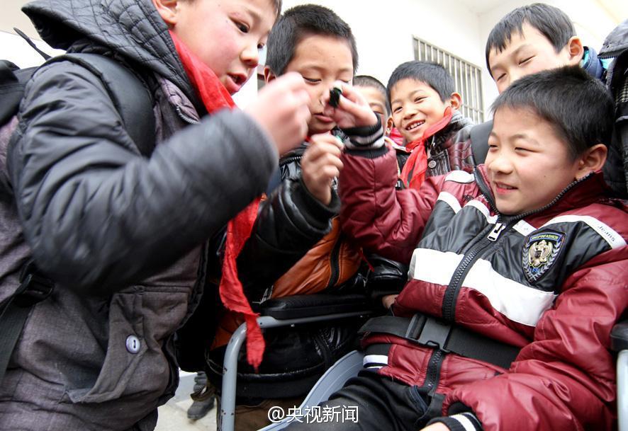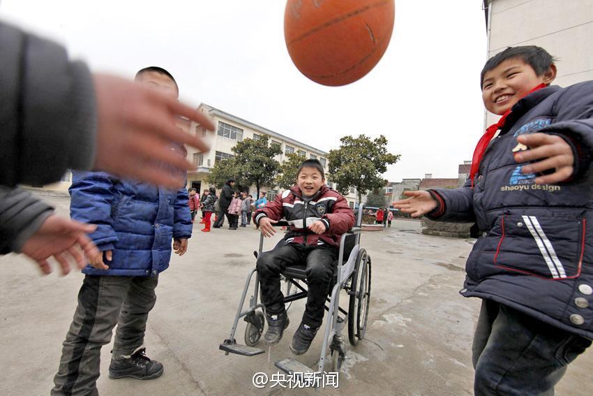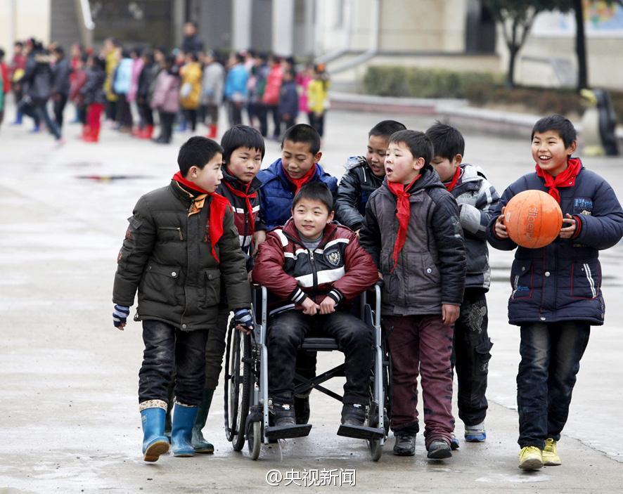 Cheng Dongdong, who suffers from amyotrophic lateral sclerosis (ALS), plays with classmates in East China’s Anhui Province. Cheng has been unable to walk on his own since developing the disease, a disorder that affects the function of nerves and muscles, seven years ago. But from elementary to middle school, Cheng has always received help from his classmates, who take turns to help him get to school, eat, and go to the toilet. One student said when he helps Cheng he feels as if he is his own brother. (Photo/Weibo of CCTV)