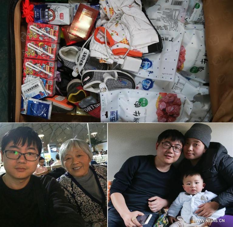 Combo photo made on Feb. 5, 2017 shows Huang Kui (R) posing in a train and stuffs in his bag. 51-year-old Huang Kui works a decorator in Shanghai. His father, in his 80s, prepared 4 chickens and 10 kilograms of eggs for his departure. People return to workplace after Spring Festival with packages prepared by their parents elaborately. (Xinhua/Pei Xin)