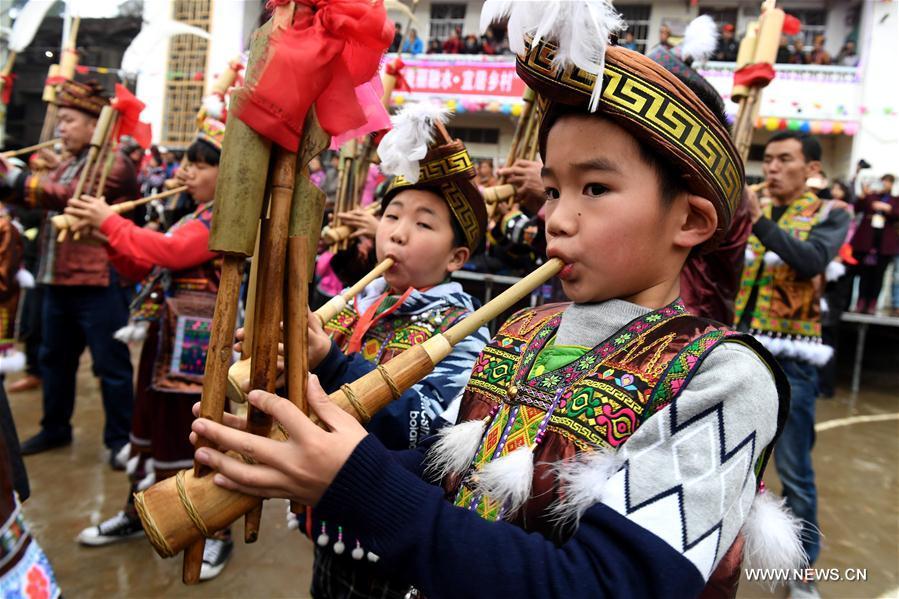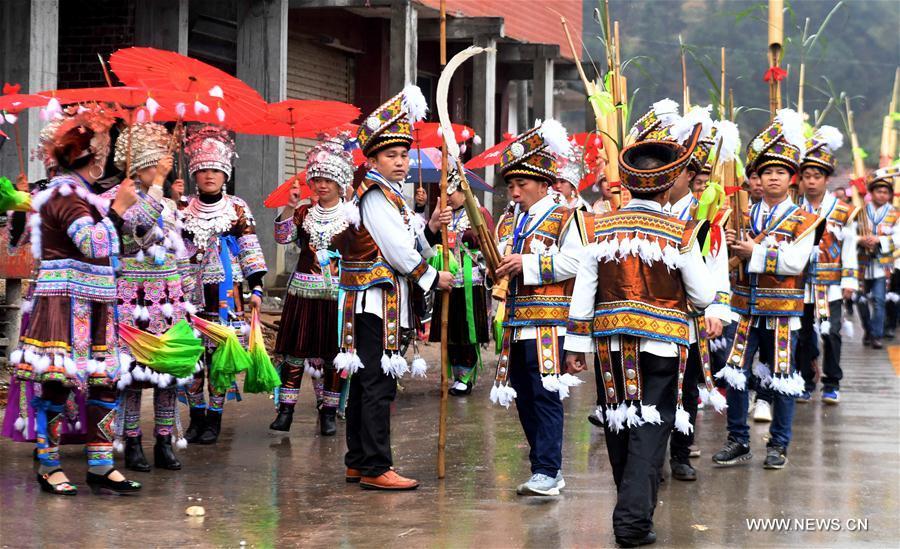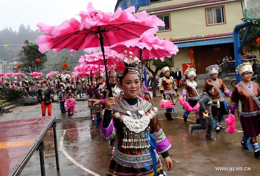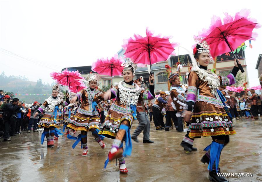 People of Miao ethnic group dance during a gathering to strengthen friendship and to celebrate the Spring Festival, or the Chinese Lunar New Year, at Lindong Village in Rongshui Miao Autonomous County, south China's Guangxi Zhuang Autonomous Region, Feb. 7, 2017. (Xinhua/Li Bin)
