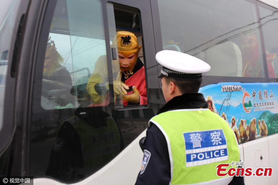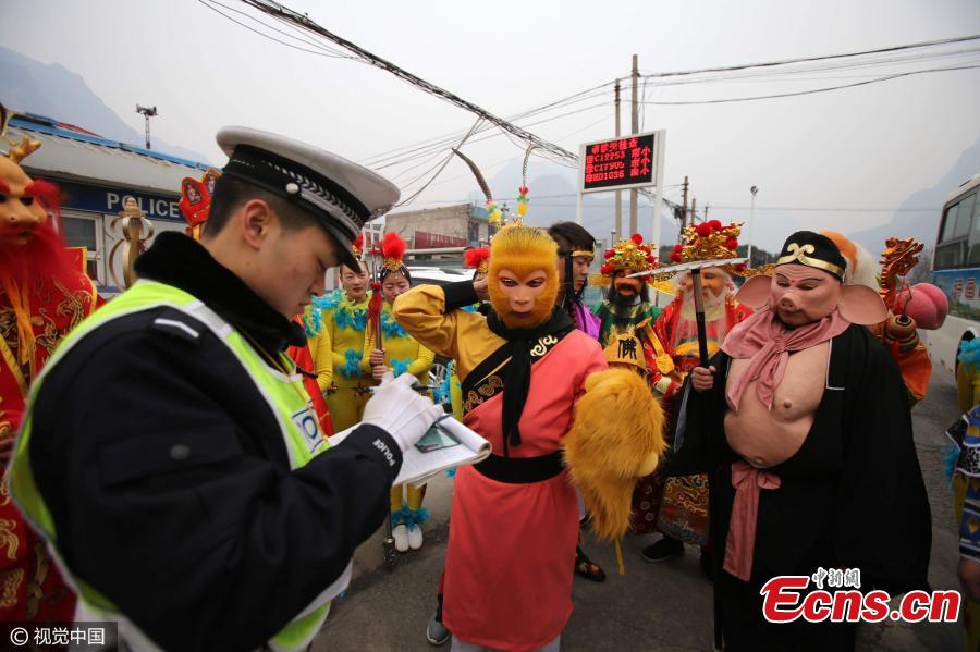 A police officer registers names of performers headed to a show in Jiyuan City, Central China’s Henan Province, Feb. 7, 2017. The performers were dressed as characters from the classic novel Journey to the West, such as the Monkey King and various monsters and deities. (Photo/CFP)
