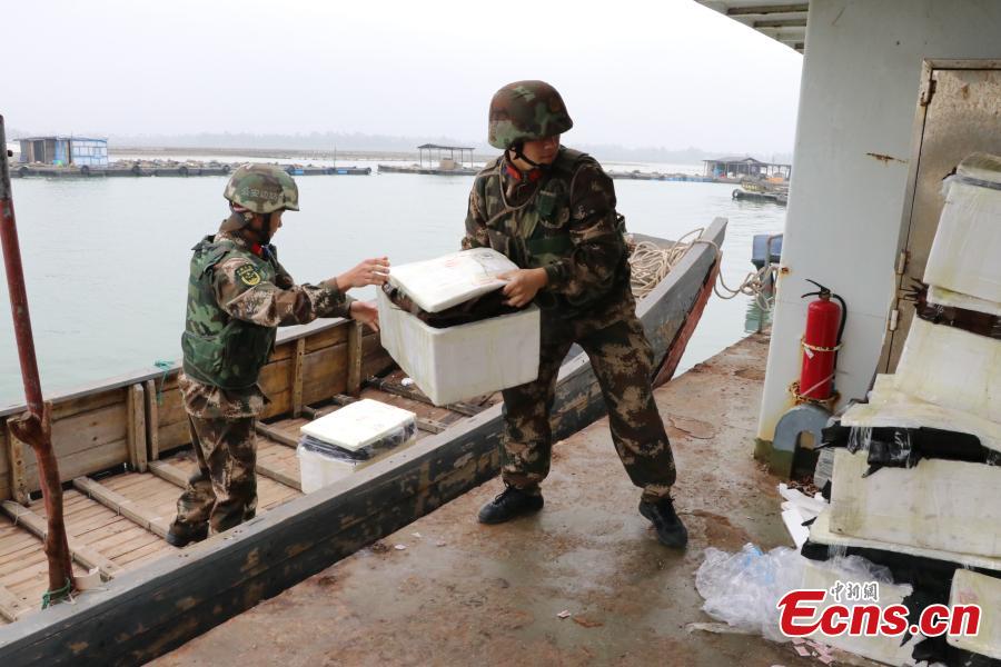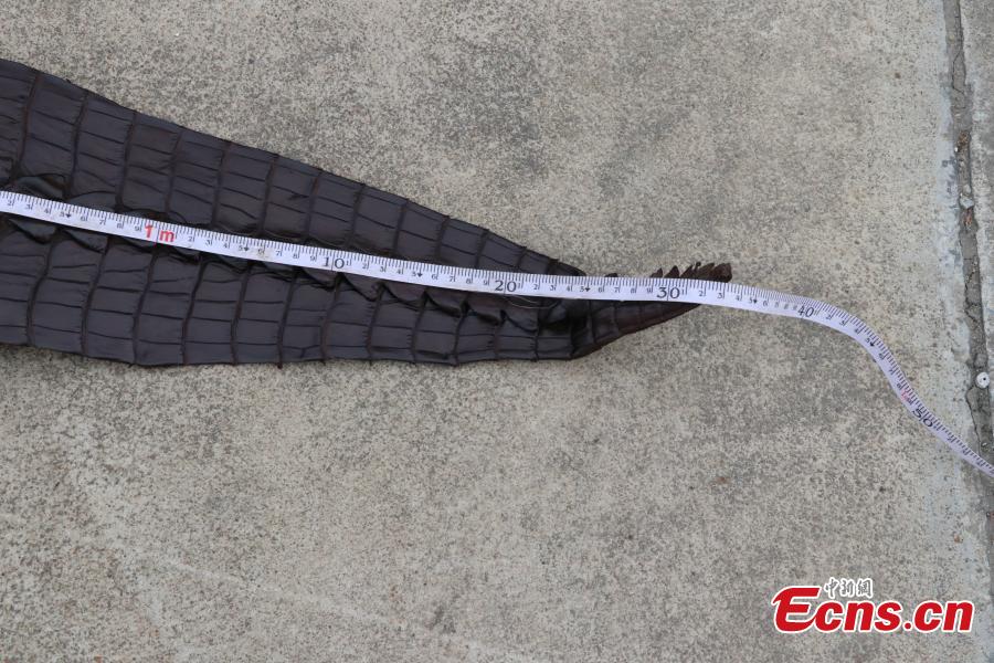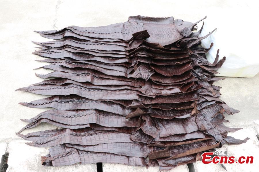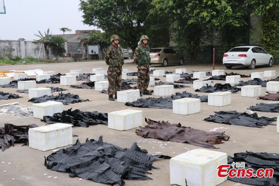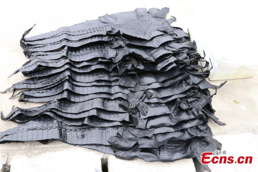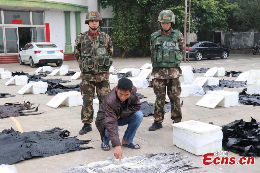 Crocodile skins seized by coast guards are on show in Fangchenggang City, South China’s Guangxi Zhuang Autonomous Region, Feb. 7, 2017. Guards seized 1,609 pieces of crocodile skin, each at 1.4 meters long, and 193 bags of suspected crocodile meat weighing 506.5 kilograms. A suspect caught said he was hired by a buyer in the city to receive the goods from a port in Vietnam. It’s illegal to smuggle crocodile or crocodile products. Crocodile skin is the upmarket of consumer goods because of its small quantities and luxurious quality. The smuggling of alligator skins is emerging as the high-end leather market flourishes. (Photo: China News Service/ Wang Lidan)