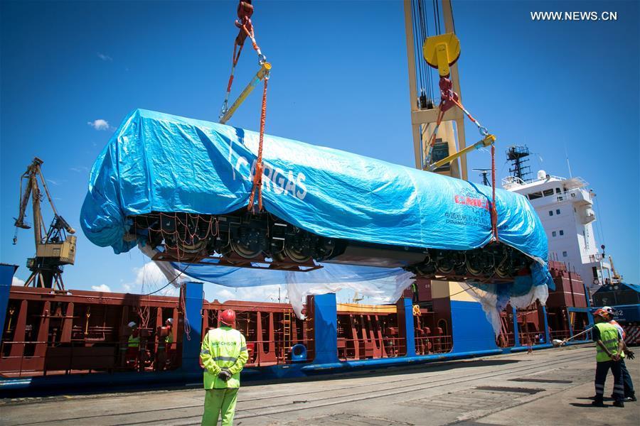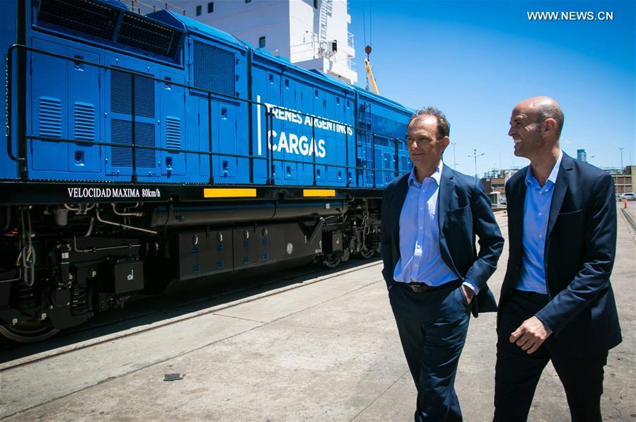 Photo provided by Argentina's Transport Ministry shows workers unloading one of the two new Chinese-built locomotives for the Belgrano Line, in Buenos Aires, Argentina, on Feb. 8, 2017. Two Chinese-built locomotives arrived in Argentina on Wednesday, as part of an ambitious plan to revive the South American country's aging cargo rail network and spur the country's economic development. (Xinhua/Argentina's Transport Ministry)