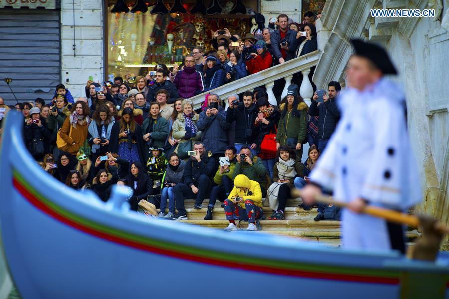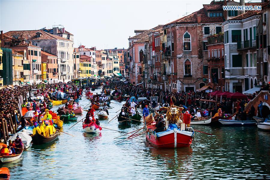 Rowers wearing costumes sail during the Water Parade event of the Venice Carnival in Venice, Italy, Feb. 12, 2017. Venice Carnival is held from Feb. 11 to Feb. 28 this year, during which parades, gala dinners, dances, masked balls and music events will be held. (Xinhua/Jin Yu)