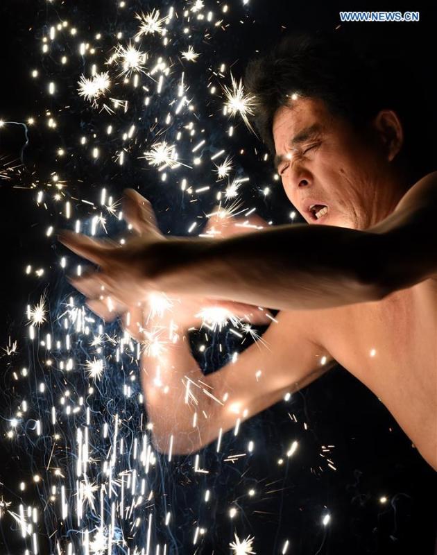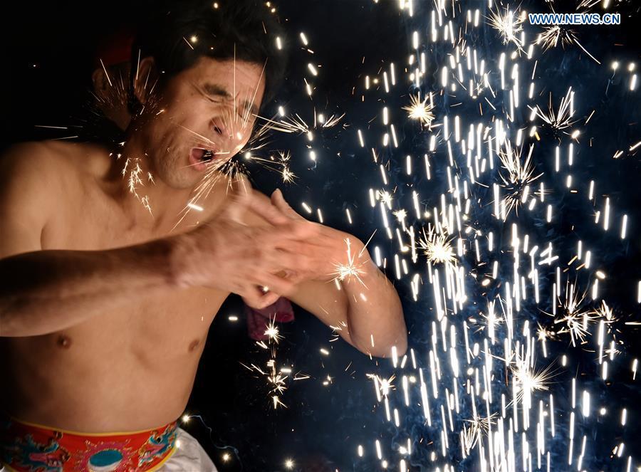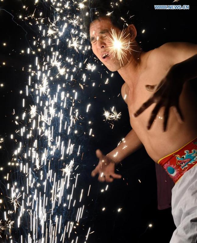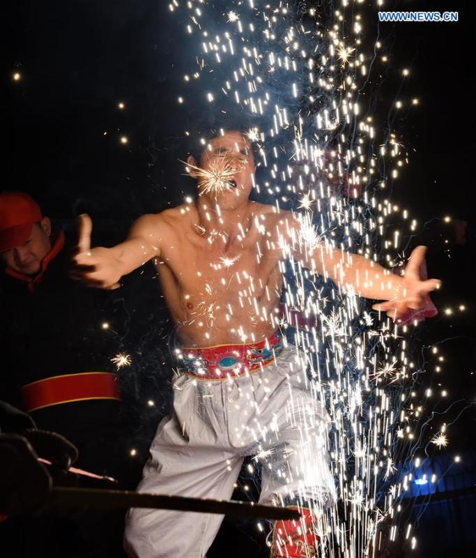 A villager performs "firework eating" in Huadong Village, Putian City of southeast China's Fujian Province, Feb. 12, 2017. "Firework eating", a folk custom during the Lantern Festival in Putian City, conveys people's best wishes in a new year. (Xinhua/Zhang Guojun)