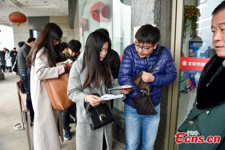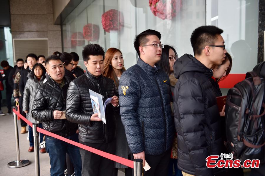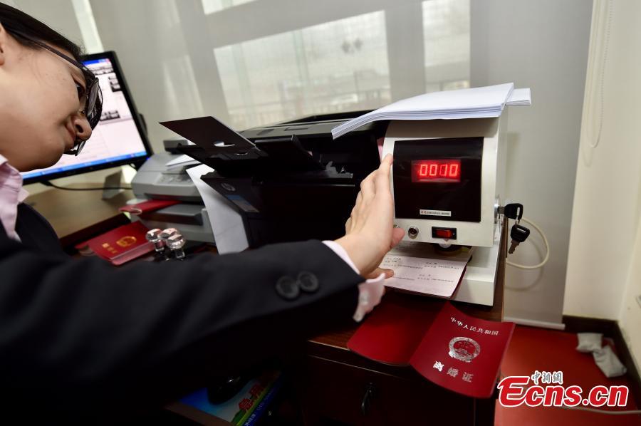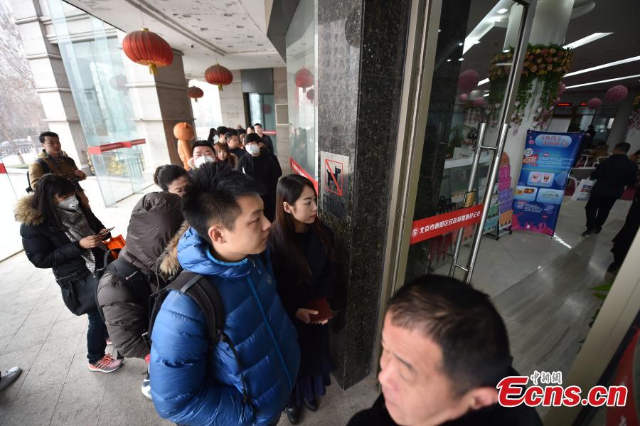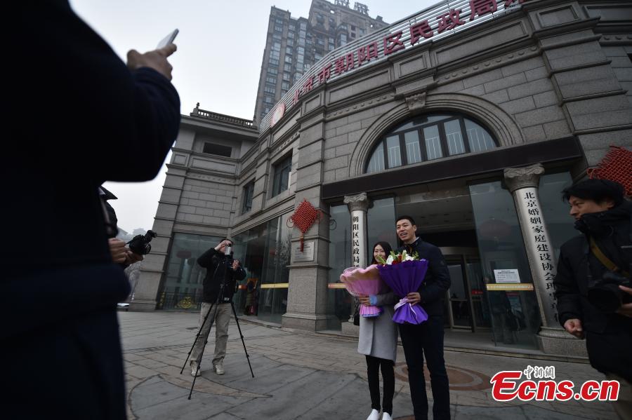 A couple shows their marriage registration certificates in Chaoyang District, Beijing, Feb. 14, 2017. The city’s marriage registry saw a great increase in the number of couples applying for registration on Valentine's Day. (Photo: China News Service/Jin Shuo)