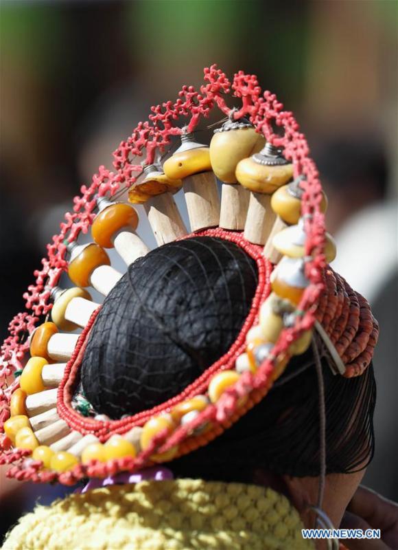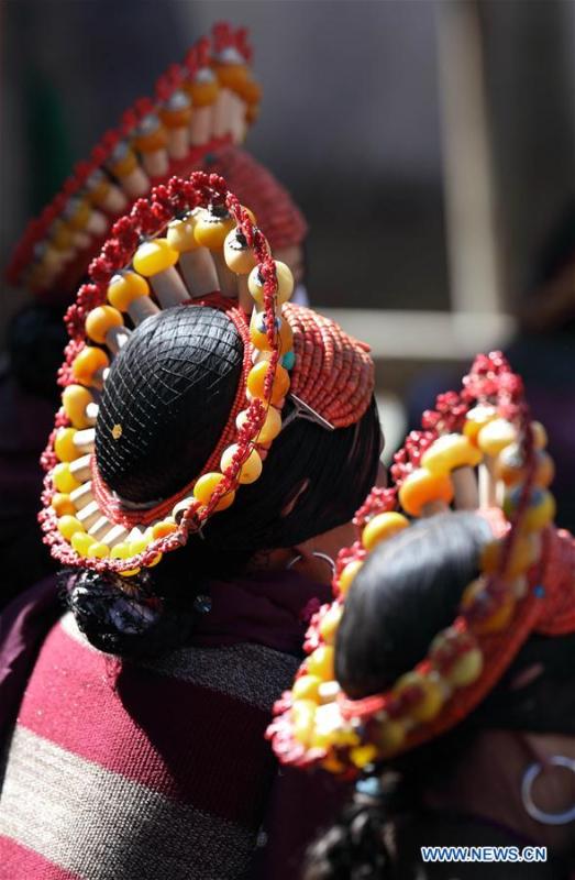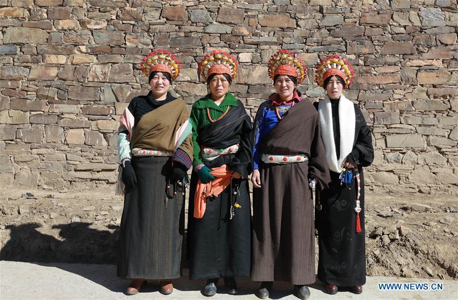 Photo taken on Feb. 13, 2017 shows Tibetan women with traditional headwears in Maoergai area of Aba Tibetan and Qiang Autonomous Prefecture, southwest China's Sichuan Province. The traditional headwears of local women were made by gems and coral and would be passed on from generation to generation. (Xinhua/Jiang Hongjing)