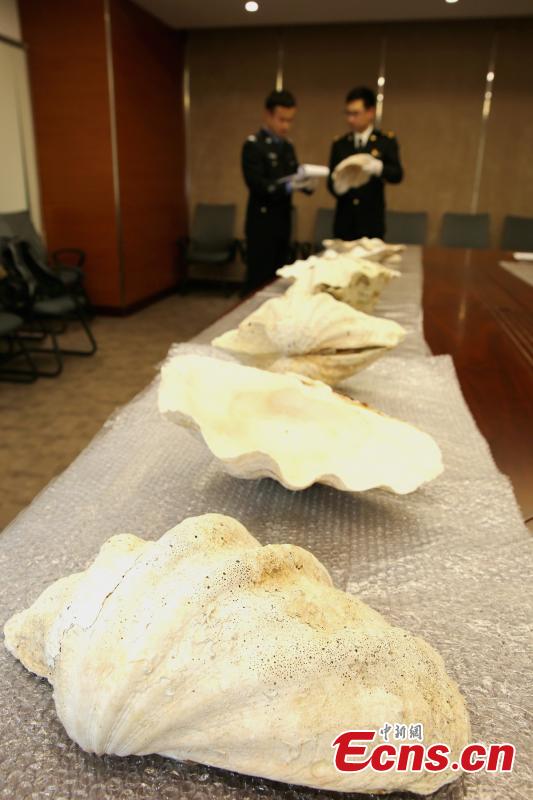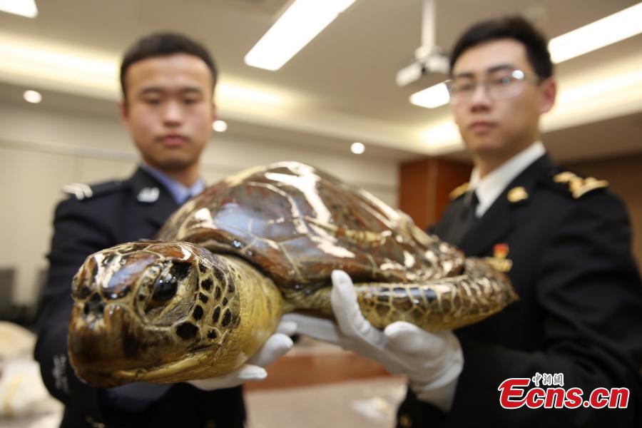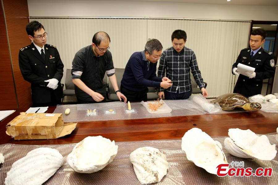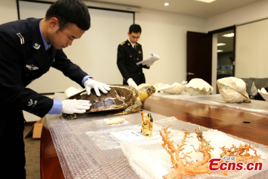 Customs officers display items they have seized in anti-smuggling cases since 2016 in Dalian City, Northeast China’s Liaoning Province, Feb. 14, 2017. The items include whale’s tusks, and specimens of green turtle and red coral. Customs in Dalian have successfully thwarted several cases where endangered aquatic animals and wildlife were being smuggled. (Photo: China News Service/Gao Shuo)
