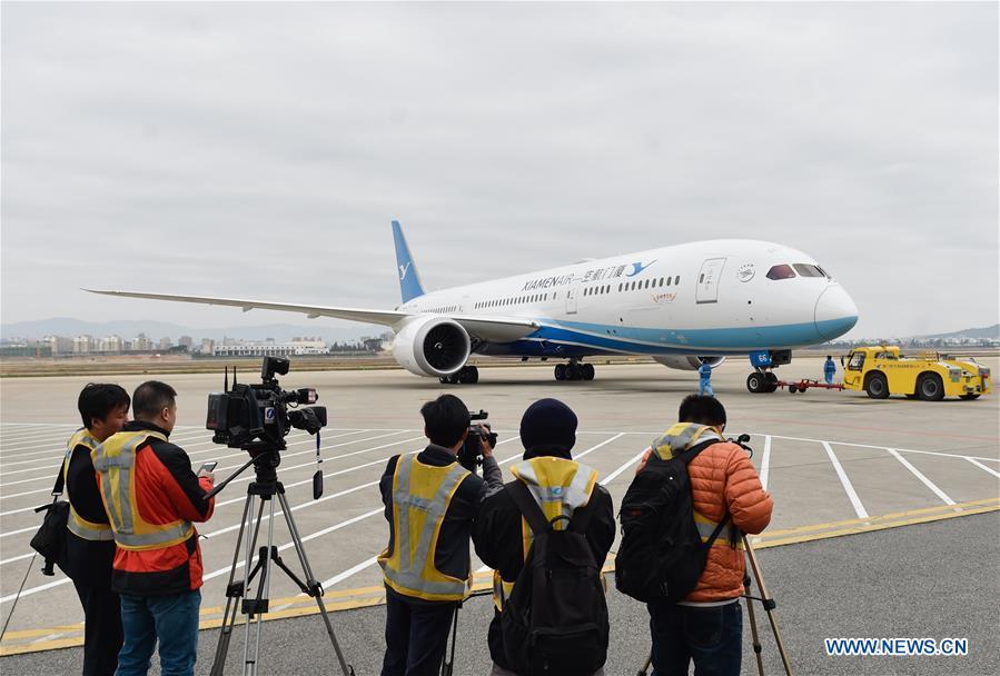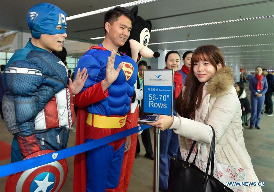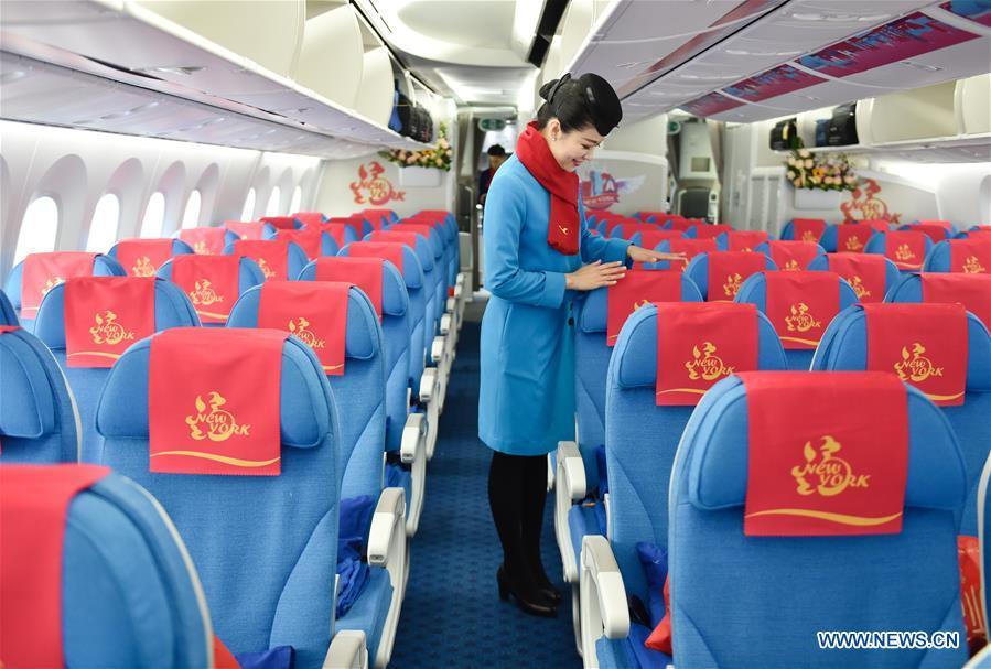 A stewardess shows a gift prepared for passengers on the flight MF849 at the Fuzhou International Airport in Fuzhou, capital of southeast China's Fujian Province, Feb. 15, 2017. MF849, the first direct flight of Xiamen Airlines from Fuzhou to New York, took off here on Wednesday. (Xinhua/Song Weiwei)