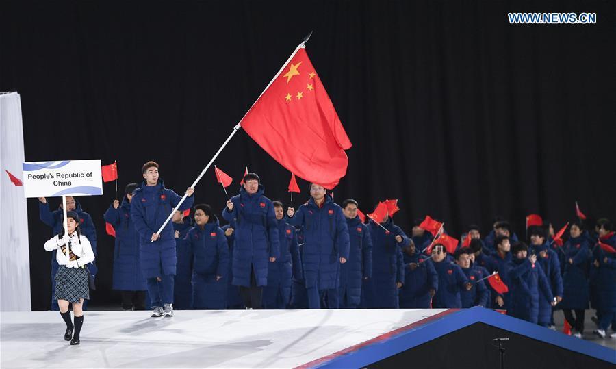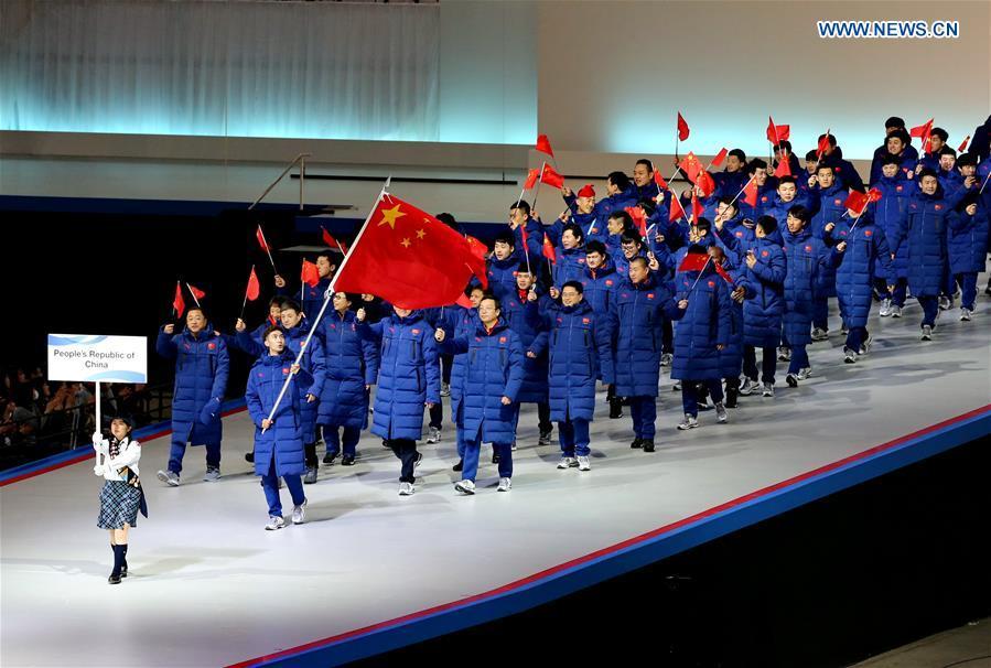 The delegation of China march in during the opening ceremony of the Asian Winter Games in Sapporo, northern Japan, Feb. 19, 2017. (Xinhua/Yang Shiyao)