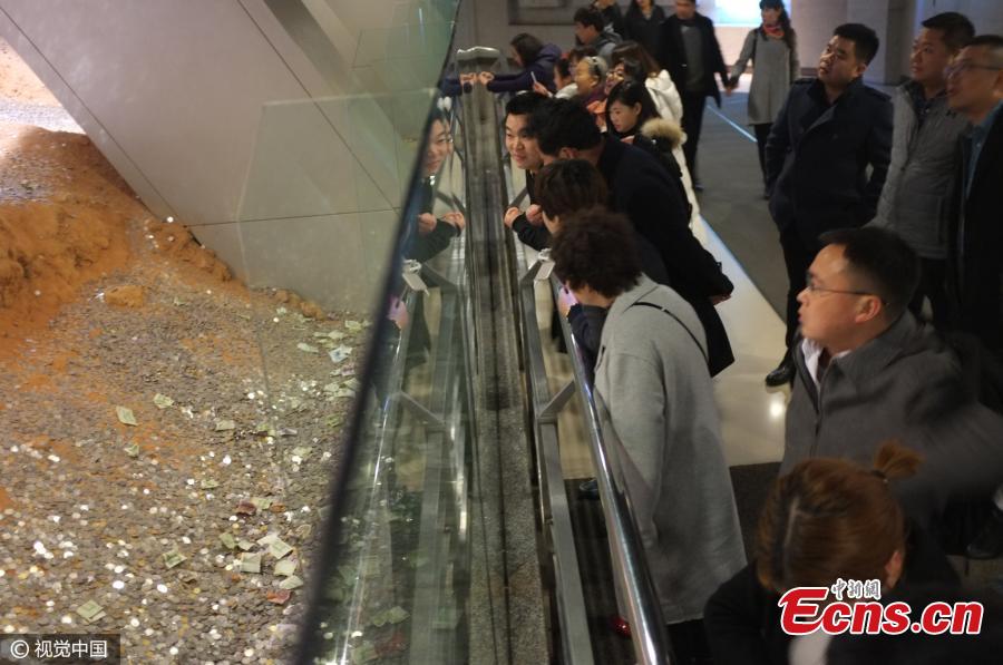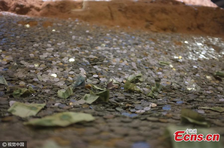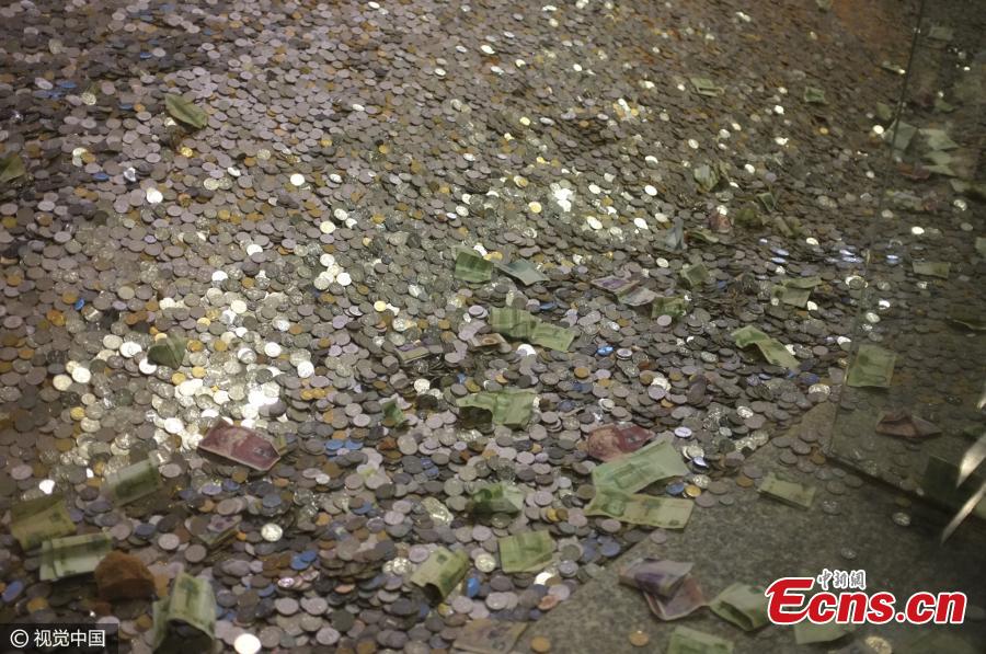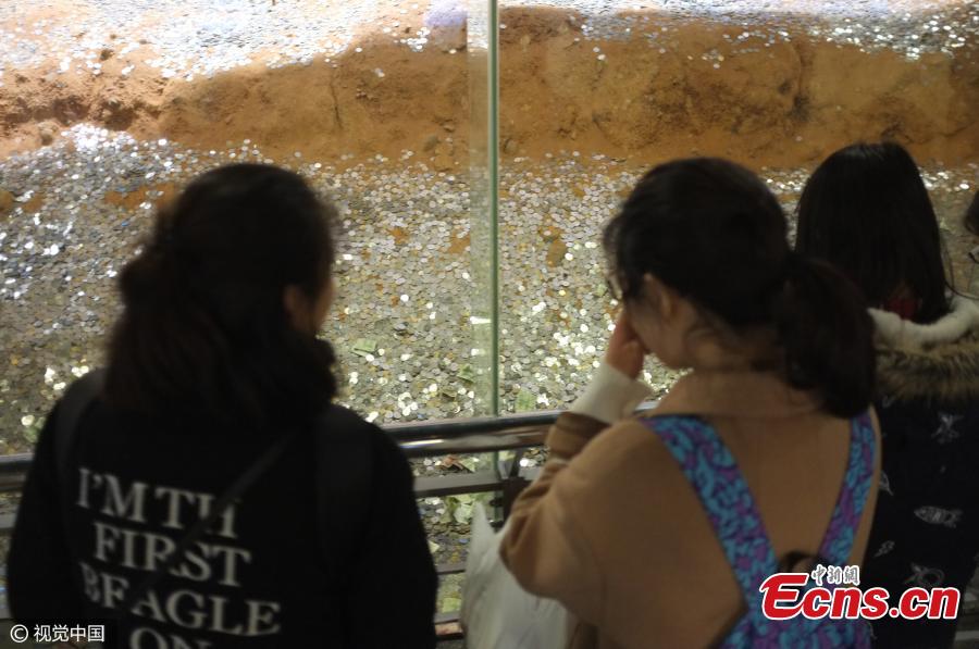 Coins and banknotes pile up at the remains of the original Leifeng Pagoda in Hangzhou City, capital of East China’s Zhejiang Province, Feb. 17, 2017. Many devotees believe that offering prayers and money at historical or religious sites can bring them luck and fortune. The pagoda was one of the ten sights of the West Lake because of the Legend of the White Snake. The original pagoda collapsed in 1924 but was rebuilt later. It has been a popular tourist attraction since. (Photo/CFP)