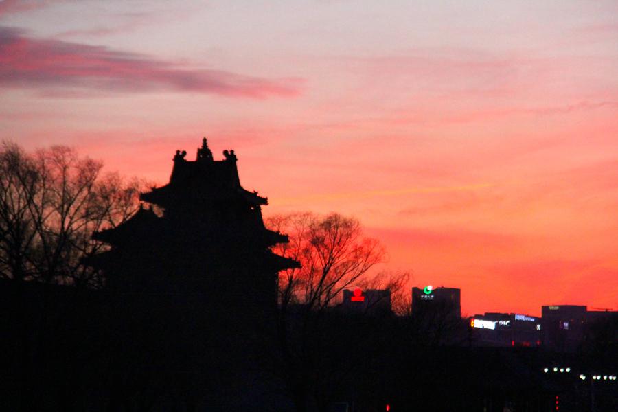 Clouds streak the sky linking the northwest Corner Tower to the Palace Museum, Feb. 19, 2017. (Photo/chinadaily.com.cn)