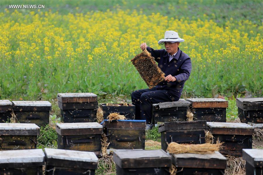 Bee-keepers harvest swarm of bees in blooming rapeseed flowers in Wan'an Township of Huangshan City, east China's Anhui Province, Feb. 20, 2017. (Xinhua/Shi Guangde)