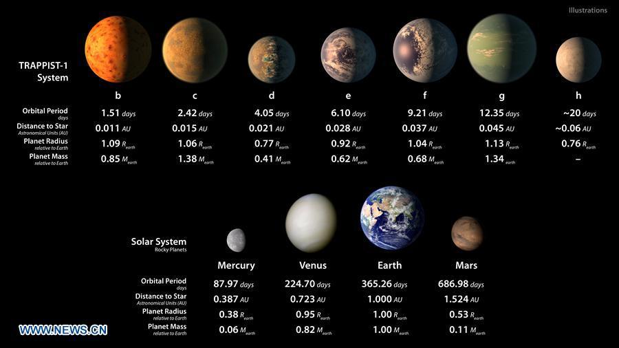 The illustration released by NASA on Feb. 22, 2017 shows the artist's concept of what the TRAPPIST-1 planetary system may look like, based on available data about the planets' diameters, masses and distances from the host star. A compact analogue of our inner solar system about 40 light years away from the Earth has been discovered, NASA announced during a press conference on Wednesday. An international team of astronomers using powerful space telescopes and ground-based observatories have discovered the first known system of actually seven Earth-sized planets orbiting the nearby TRAPPIST-1, which is relatively close to us, in the constellation Aquarius. And three of these planets are firmly located in the habitable zone, the area around the parent star where a rocky planet is most likely to have liquid water. (Xinhua/NASA/JPL-Caltech)