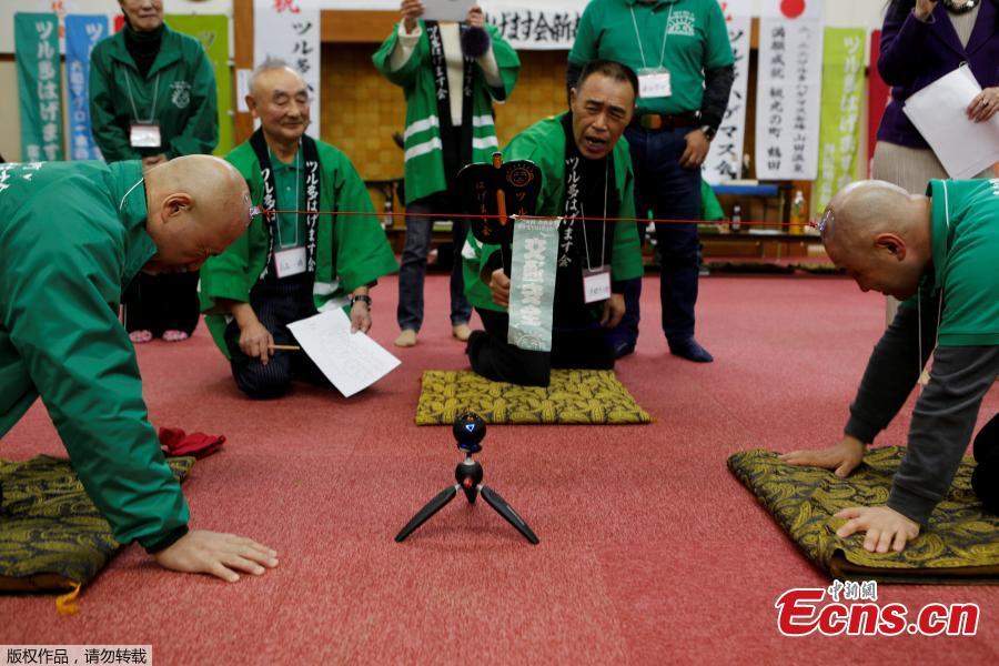 Members of the Bald Men Club, take part in a unique game of tug-of-war by attaching suction pads onto their heads, at a hot spring facility in Tsuruta town, Aomori prefecture, Japan, Feb. 22, 2017. The club, which has attracted roughly 65 members from all over the country since its founding in 1989, encourages people to “view baldness in a positive manner, to have fun, and to brighten the world with our shiny heads,” according to its website.(Photo/Agencies)