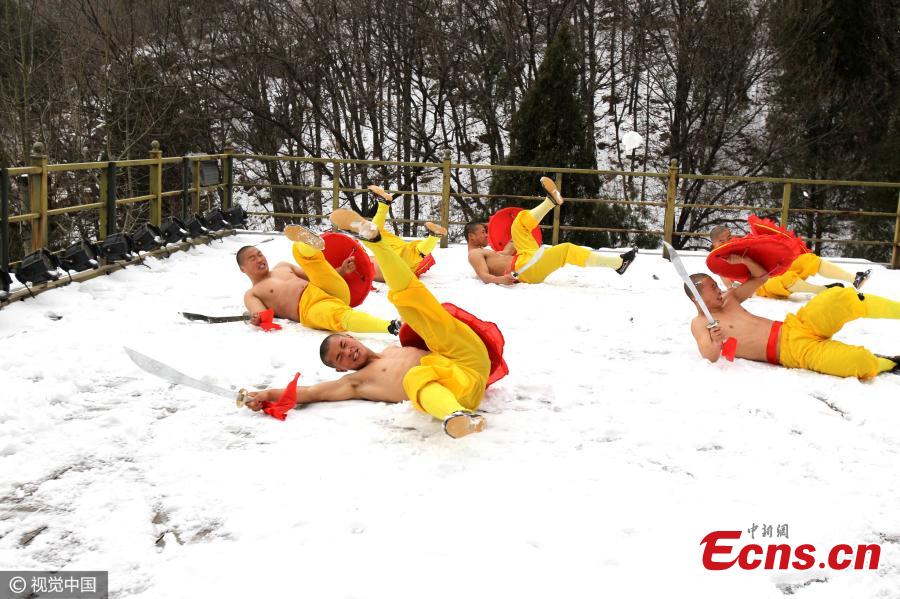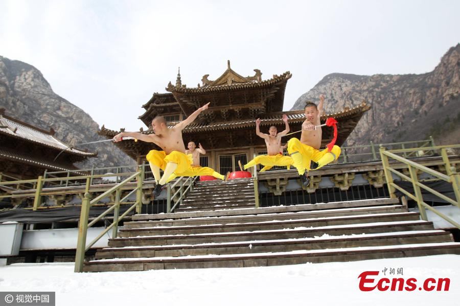 Monks practice kung fu in a snow-covered field at the Shaolin Temple in Dengfeng City, Central China’s Henan Province, Feb. 22, 2017. Despite cold weather, the monks are continuing to train for a music show. The youngest monk is six years old. (Photo/CFP)