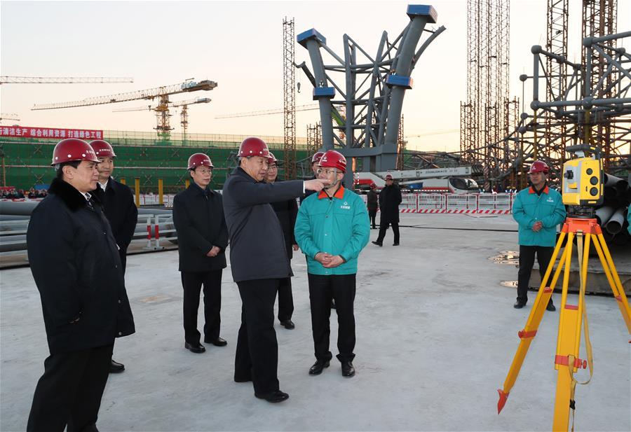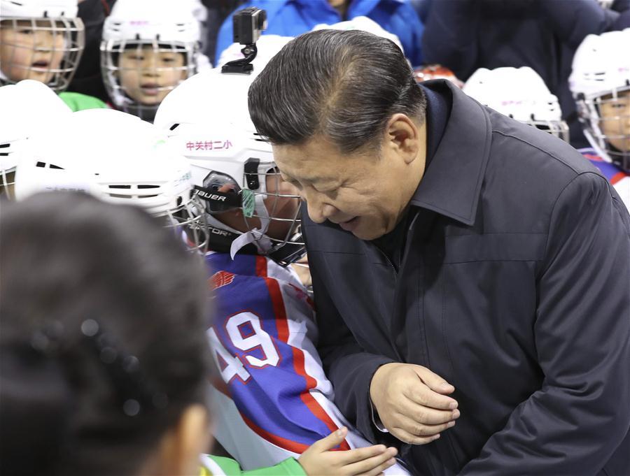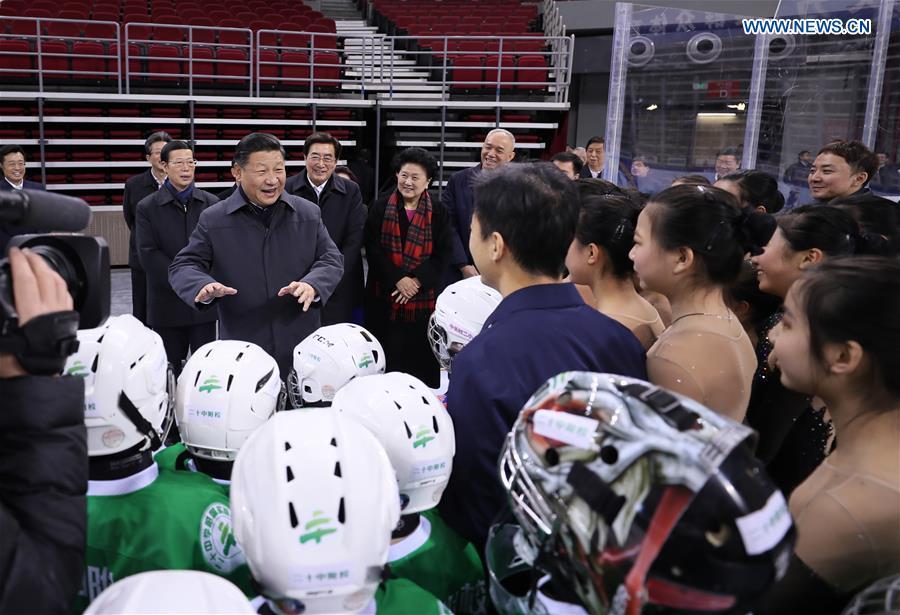 Chinese President Xi Jinping poses for a group photo with ice hockey and skating fans at Wukesong sports center in Beijing, capital of China, Feb. 24, 2017. Xi, also general secretary of the Communist Party of China Central Committee and chairman of the Central Military Commission, made an inspection tour in Beijing Thursday and Friday. (Xinhua/Ding Lin)