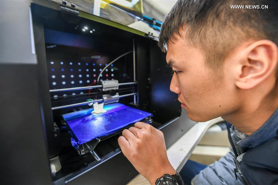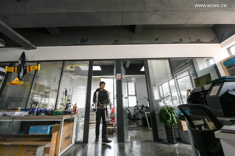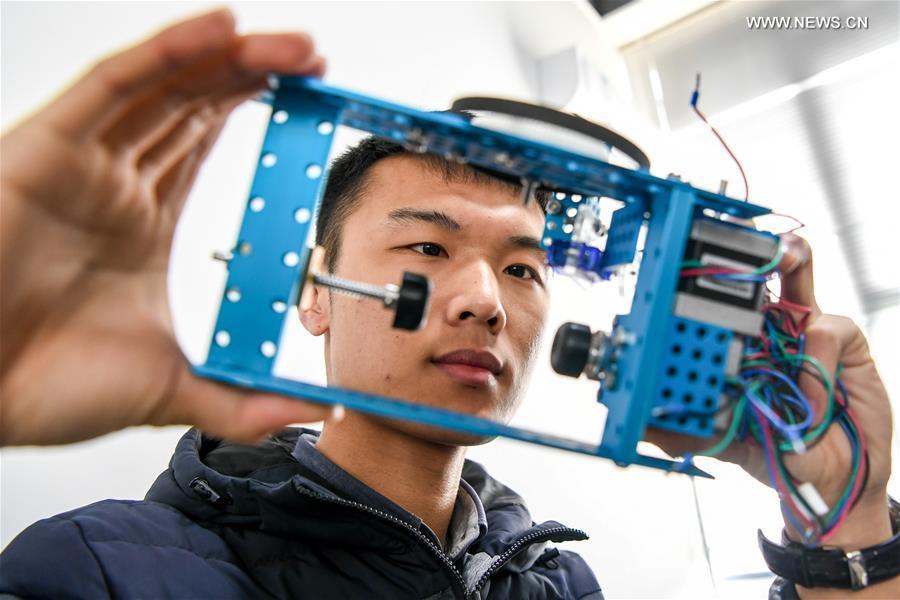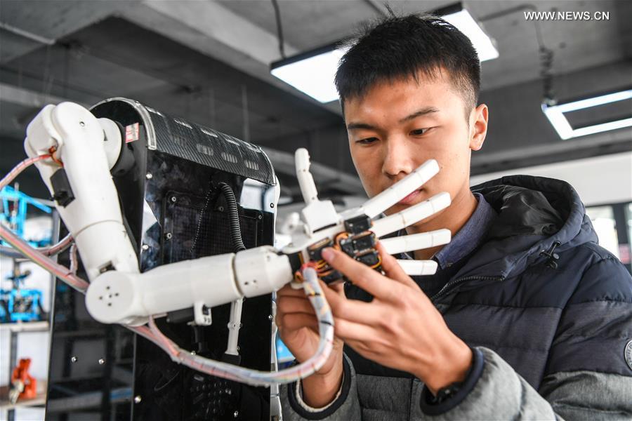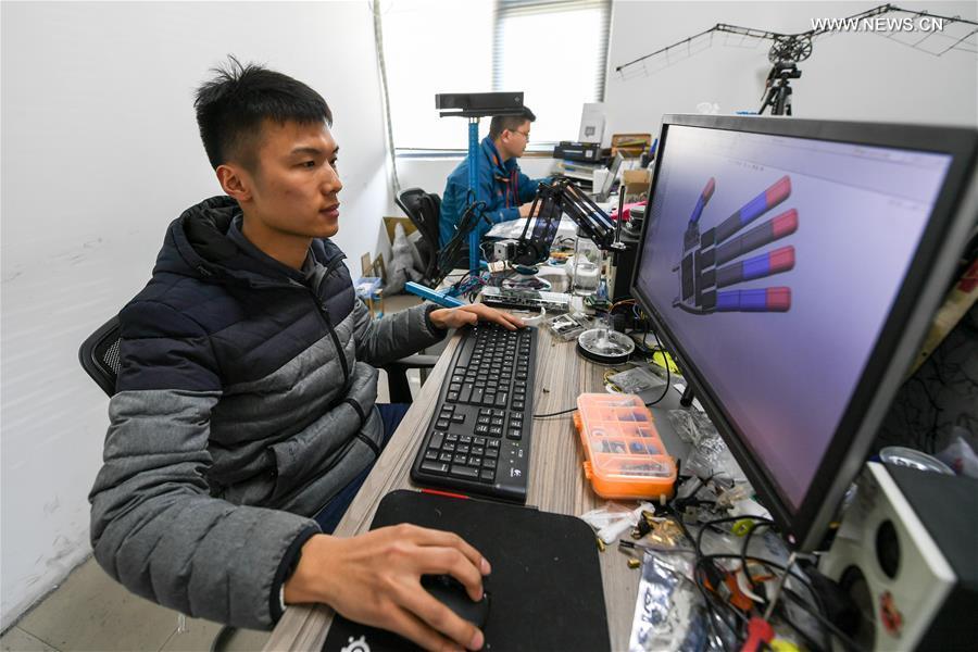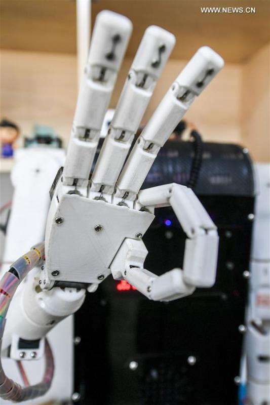 Song Jiyuan poses with a robot adept in interpreting sign language at a makerspace of the National University Science Park of Henan Province in Zhengzhou, capital of central China's Henan Province, Feb. 23, 2017. The robot, developed by Song Jiyuan, a student from mechanical engineering department of Zhengzhou University, and his classmates, can quickly interpret sign language as well as translating voice into sign language. Song hoped the robot could work as sign language interpreter to serve the deaf and mute in public places. (Xinhua/Li Bo)