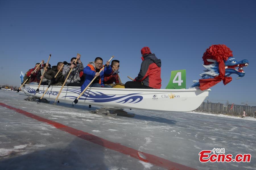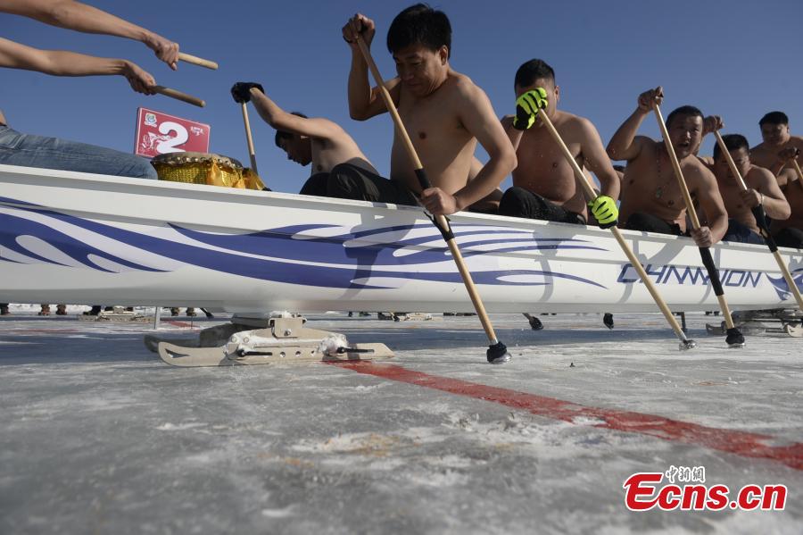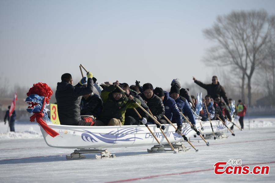 Participants compete in a dragon boat race held on ice in Duolun County, Xilingol League, North China’s Inner Mongolia Autonomous Region, Feb. 26, 2017. The ice adaptation of dragon boat racing is part of programs to boost winter tourism. (Photo: China News Service/Liu Wenhua)