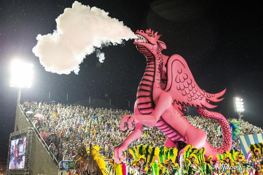 A float of Paraiso do Tuiuti samba school participates in the parades of the Carnival at the Sambadrome in Rio de Janeiro, Brazil, on Feb. 27, 2017. Special groups' Samba Schools of the Rio Carnival 2017 started their parade here on Sunday. (Xinhua/Li Ming)