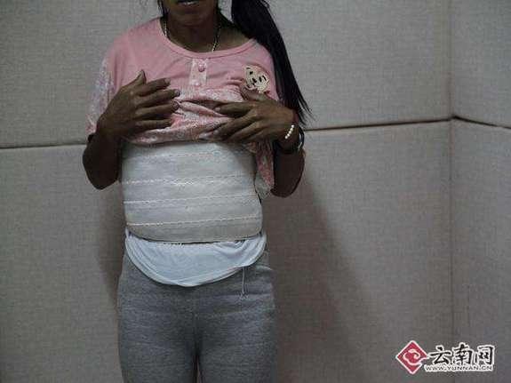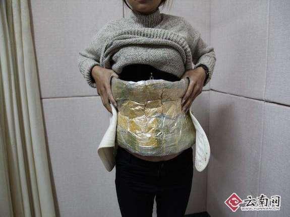 A pregnant woman is detained for transporting drugs wrapped on her body in Jinggu County, Pu’er City, Southwest China’s Yunnan Province, Feb. 28, 2017. After receiving a tip-off, local police arrested two pregnant women who had more than 3kg of methamphetamines in a car. (Photo/Yunnan.cn)