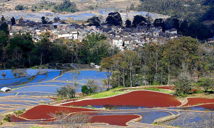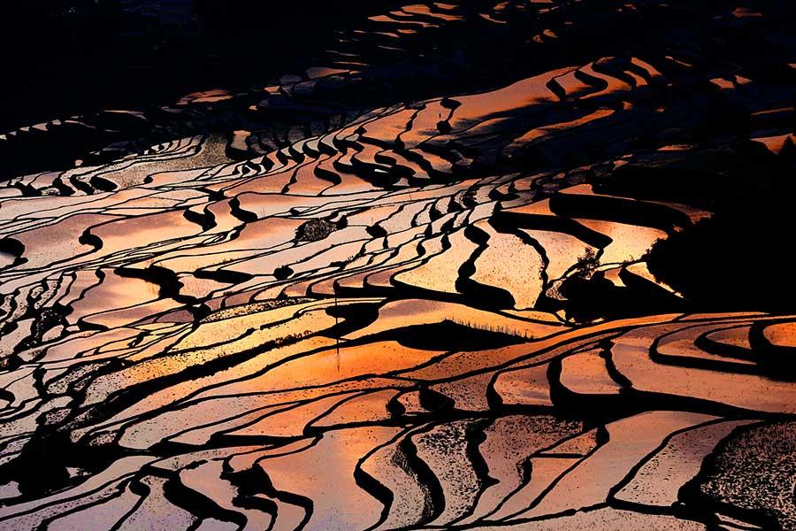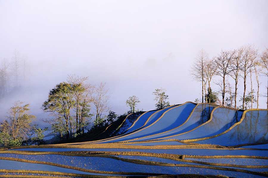 Spring scenery of the Honghe Hani Rice Terrace is seen in Yuanyang county, Honghe Hani and Yi autonomous prefecture, Southwest China's Yunnan province. As a UNESCO World Heritage Site, Hani Terrace scenery mesmerizes with its many colors. When looked at from afar, zigzagging lines of the terraces look smooth and elegant, and together with the changing daylight, the scene can be truly breathtaking.(Photo by Zeng Yonghua/China Daily)