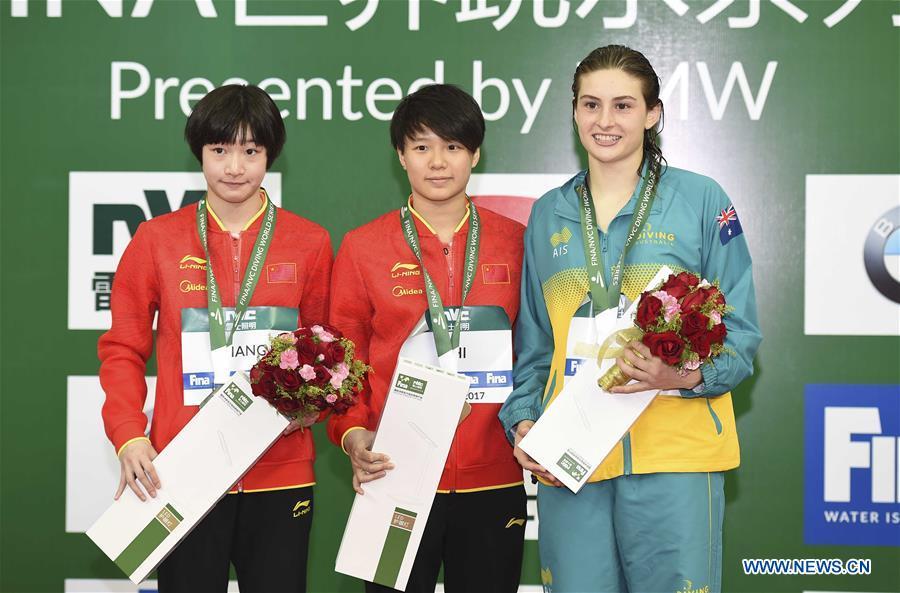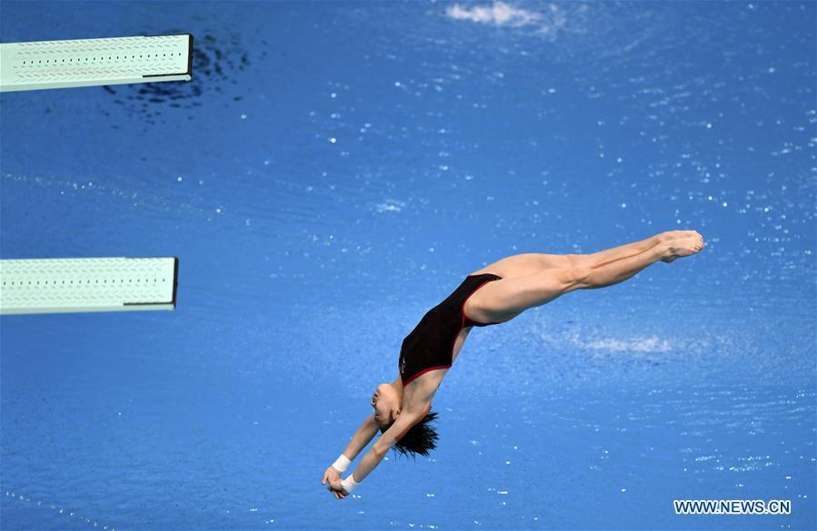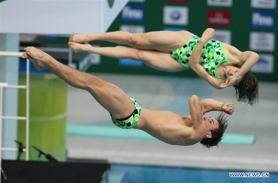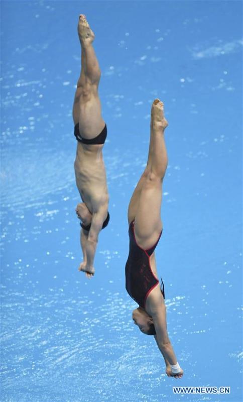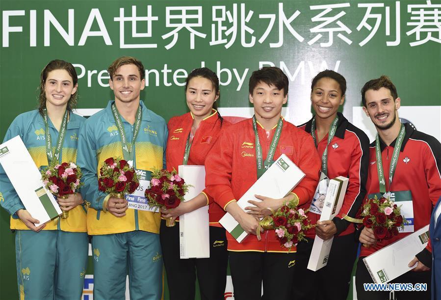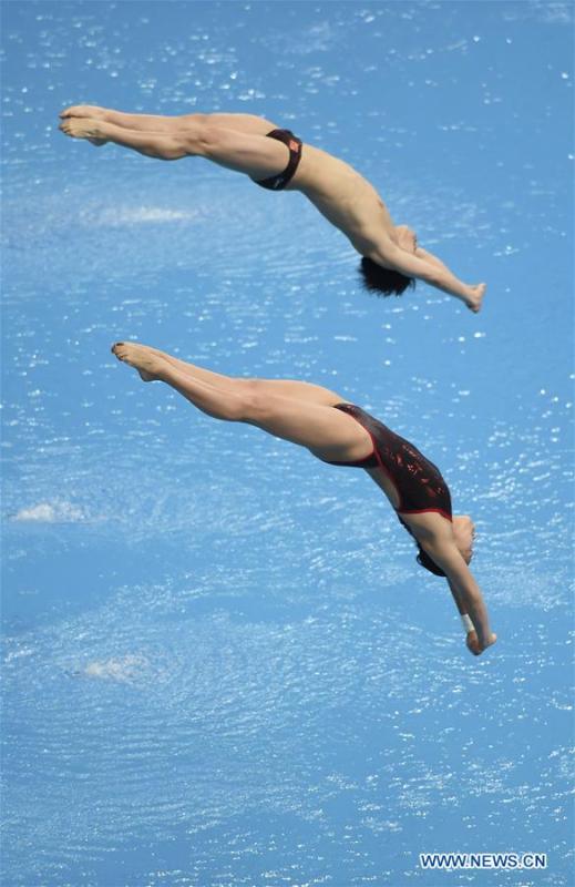 Wang Han (front)/Li Zheng of China compete during the mixed 3m springboard synchro final of the FINA Diving World Series 2017 in Beijing, capital of China, March 4, 2017. Wang Han/Li Zheng claimed the title of the event with a total of 323.10 points. (Xinhua/Xu Zijian)