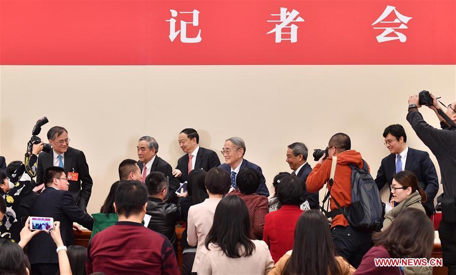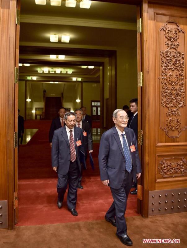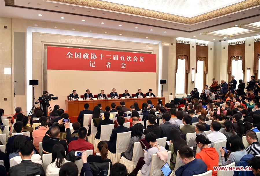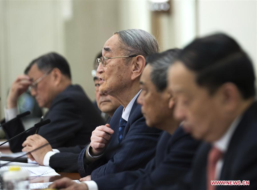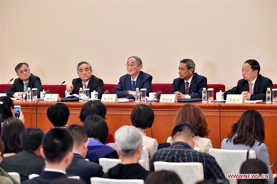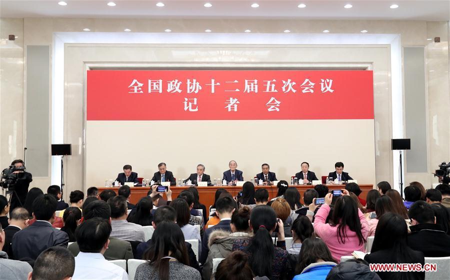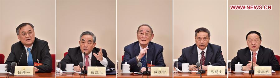 Li Yining, Chen Xiwen, Yang Kaisheng, Chang Zhenming and Qian Yingyi, members of the 12th National Committee of the Chinese People's Political Consultative Conference (CPPCC), attend a press conference for the fifth session of the 12th CPPCC National Committee on promoting stable and healthy economic growth at the Great Hall of the People in Beijing, capital of China, March 6, 2017. (Xinhua/Zhang Yuwei)